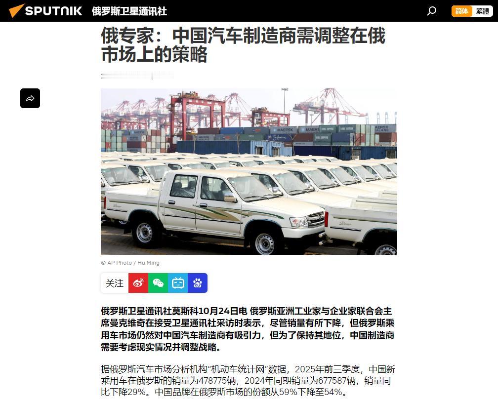 俄中贸易额下降近10%,中国汽车对俄罗斯出口下降55%。   日前,俄罗斯驻华大使伊戈尔·莫尔古洛夫向俄罗斯商业新闻网透露,今年前九个月俄中两国的贸易总额达到1636亿美元,和2024年同期相比减少了九个多的百分点,接近10%。   其中,变化比较明显的是汽车出口领域,1到9月中国对俄罗斯市场的汽车供应量下降了55%,这个降幅确实不算小。   不过即便如此,中国出口的汽车在俄罗斯市场上依旧保持着较高的受欢迎度,2025年第一季度市场份额已突破55%,意味着当地每卖出两辆新车就有一辆是中国品牌,可见当地消费者对中国汽车的认可并没有因为出口量下降而减弱。   对于贸易额下降的原因,俄罗斯副总理曼图罗夫也给出了自己说法,其认为主要是受到外部负面因素的影响,属于短期波动,而不是战略上的变化。   以当下的视角来看,中俄贸易量出现下降,确实算不上什么好消息,但这绝不意味着中俄之间的关系发生了质的变化。国家之间的贸易往来本就存在周期性的波动,有上升的时候自然也会有下降的时候,这是很正常的现象。   就拿前几年来说,中俄贸易持续攀升,2024年更是创下2448亿美元的历史新高,今年即便前九个月下降10%,1636亿美元的规模依旧远超2022年同期水平。   所以现在就对中俄贸易的整体趋势下结论还为时过早,至少得等明年的贸易数据出来,才能对短期的走势做出一个相对准确的判断。   而从实际情况来看,虽然中国汽车对俄出口量下降了55%,但市场份额仍能维持在50%以上,这也从侧面说明中国汽车在俄罗斯市场的竞争力依然强劲。   此前奇瑞通过欧萌达、捷途等多品牌矩阵快速占领市场,吉利、哈弗凭借高性价比SUV车型成为街头主流,即便出口量短期调整,本土化适配的产品根基并未动摇。   而俄罗斯政府近期推出的新能源汽车补贴政策,最高达62.5万卢布的购车补贴,也为中国新能源车企业提供了新的出口契机。   对于贸易额整体下降,外部环境的变化确实会带来一定影响,比如全球供应链的调整、国际市场需求的波动等,这些因素都可能在一定程度上影响两国的贸易往来。   但双方在关键领域的合作反而持续深化,以能源领域为例,“西伯利亚力量”天然气管道今年输气量已达380亿立方米设计产能,9月双方更达成协议将年供气量提升至440亿立方米,未来随着新通道建设还将新增580亿立方米年输气量。   这些互补性极强的合作,正是中俄贸易抵御短期波动的坚实基础,也让未来恢复稳定增长充满期待。