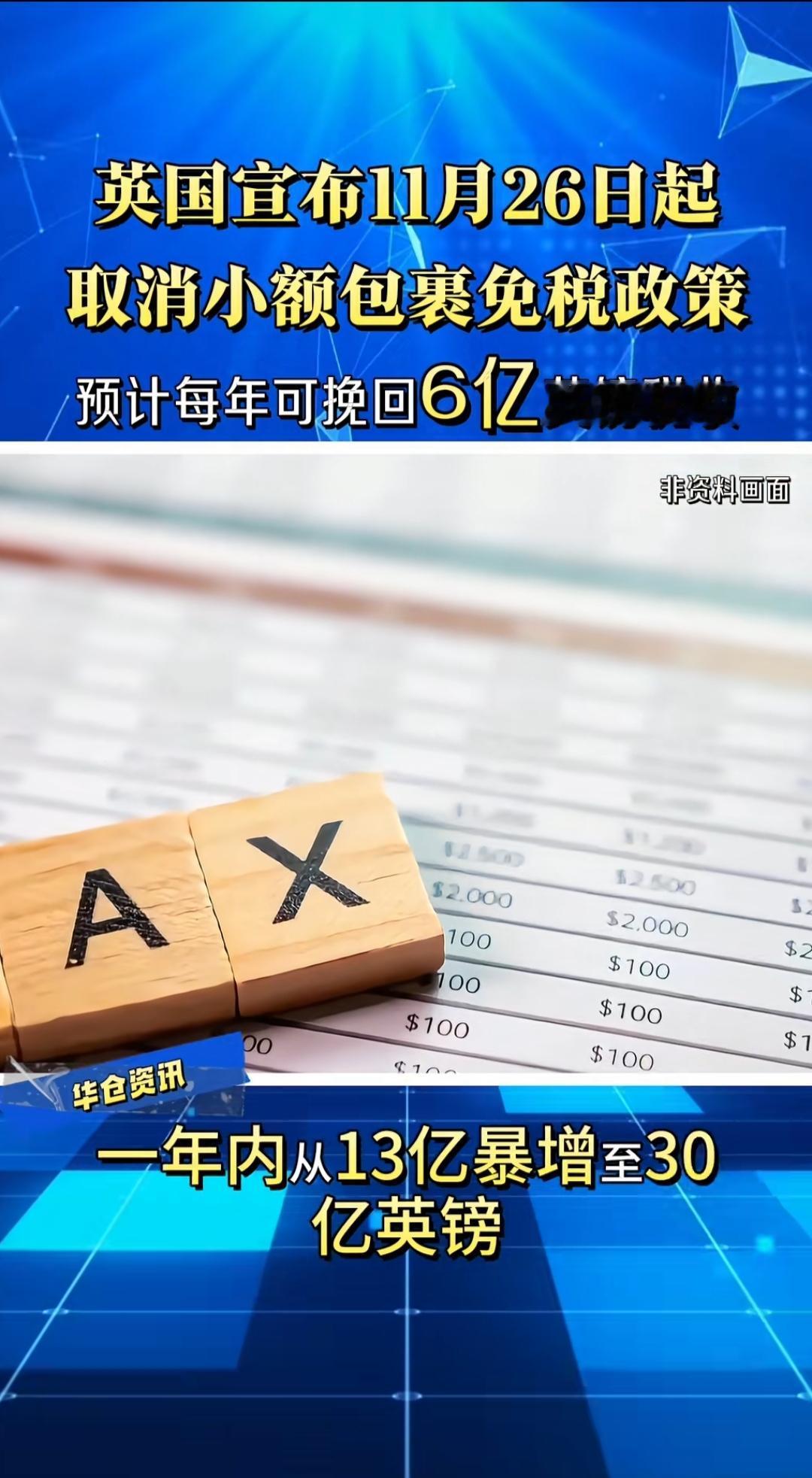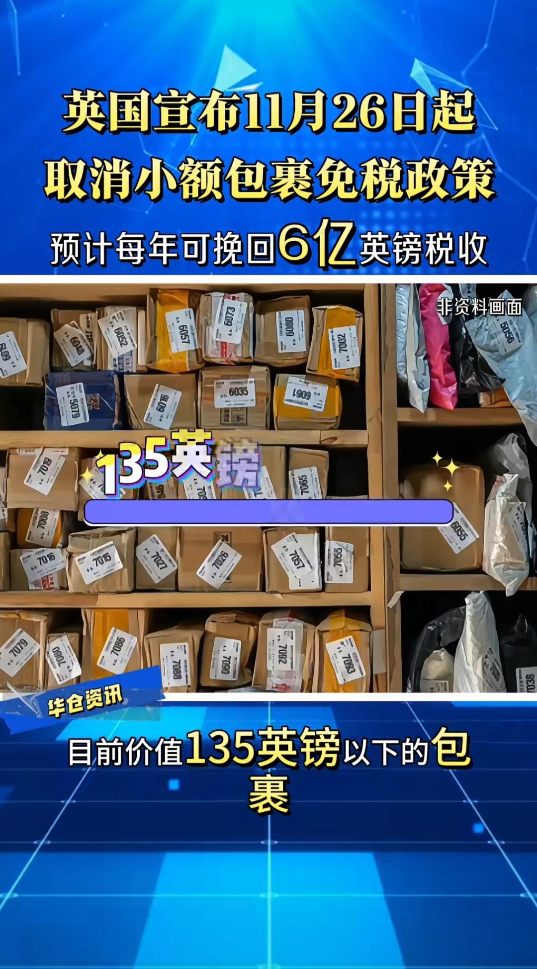 英国跟进美国、欧盟,11月26日起取消小额包裹免税政策。135英镑以下的包裹,要