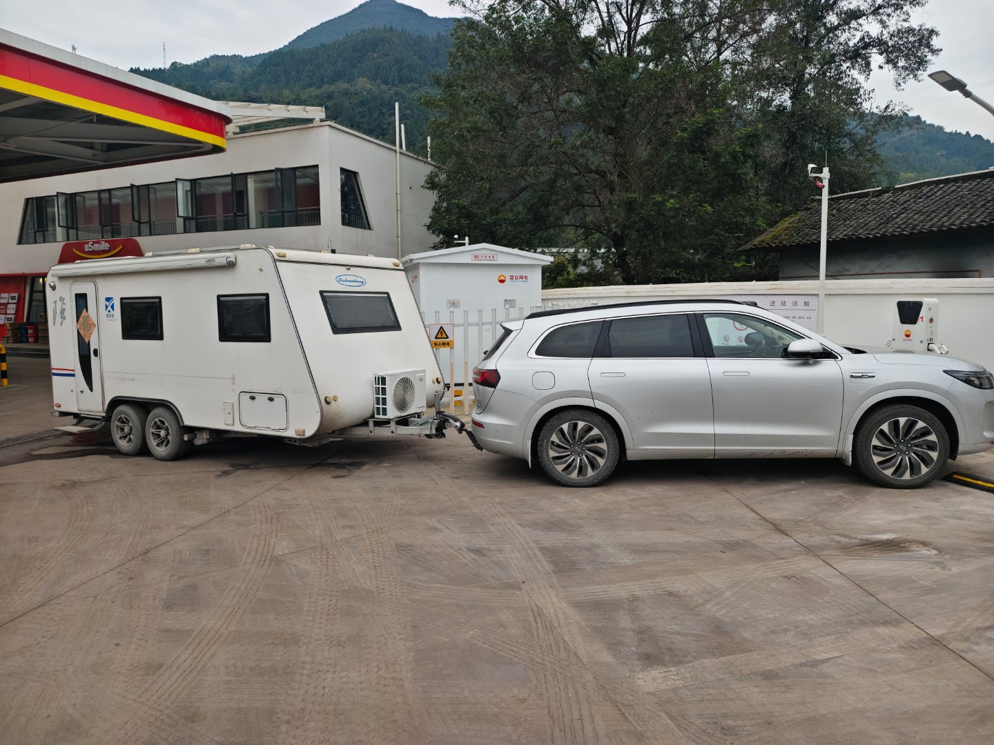 来充电,碰到一辆老款问界M7拖挂着一辆房车,武汉车牌,看样子是来这边旅游路过的
