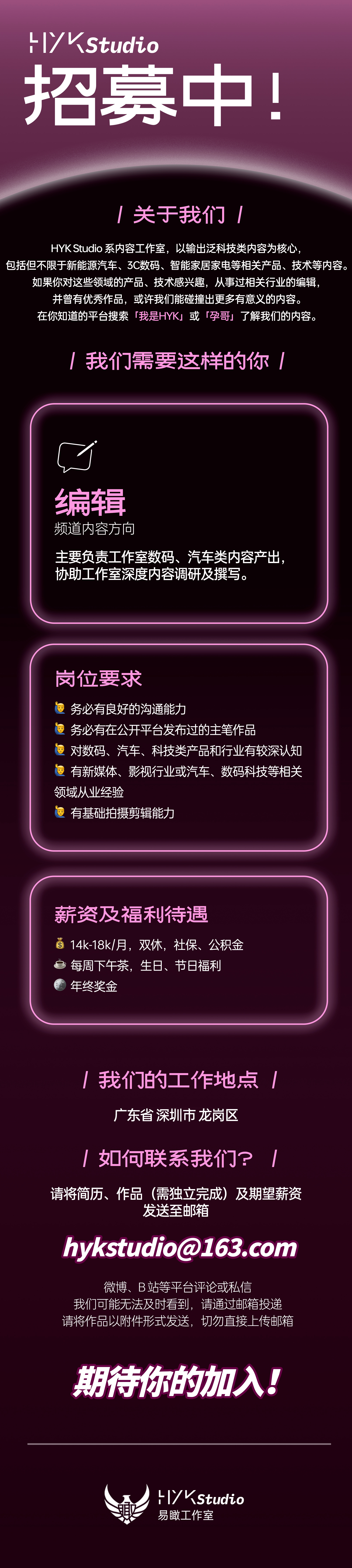 为了能有更优质、更稳定、更及时的视频以及其他内容产出,我们希望招聘一位编辑同事。有意向的朋友请将简历、作品(需独立完成)及期望薪资发送至邮箱:hykstudio