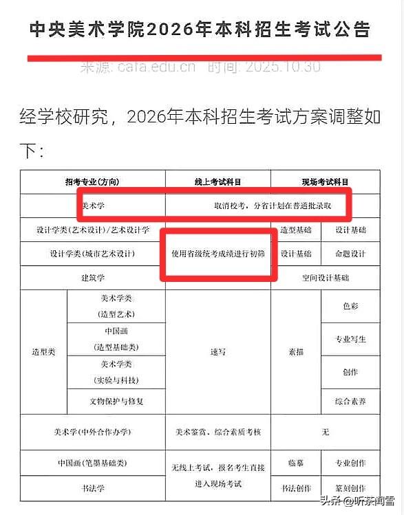 十年同窗不刻苦,一朝学“艺”上大学! 这些年,有多少平时不刻苦,告学“艺术”走运的混子生上了大学?没人统计过,但它却打破了高考的公平,让很多“普通类”考生愤愤不平。 近日,中央美术学院招生改革,像一记响亮的巴掌,啪啪打在几十万美术生脸上,也让相关艺考生瞬间尴尬,不知所措。 按照央美2026年招生新政,美术学专业直接按高考文化分录取,设计类、建筑学等专业以省级统考成绩初筛,校考大幅缩减。 这场艺考改革震动不小,终于让投机学艺术的学生与大家同台竞技,这才是公平、正道。 过去“专业过线+文化保底”的艺考模式被打破,文化分不达标的,即便画技再精,也只能止步门外,依旧落榜。 高考需要公平,艺考不应成捷径。以省统考初筛“预考”,实质上也是公平的体现。目的是淘汰投机者,回归艺术本质,弱化艺术教育功利性。 可能有人质疑,那美术生两三年功夫不就白废了?事实上,艺考生95%以上都是赶鸭子上架,大多是为钻空子才学的“艺术”。 如今,艺考指挥棒转向“文化+专业”,当“会画画的学霸”将成为新标杆。 艺术教育的未来是更纯粹,还是更内卷?眼下看不出,更不知这是艺术生的春天,还是寒冬呢? 艺术生高考 艺考经验 美术生高考 艺术生高考真相
