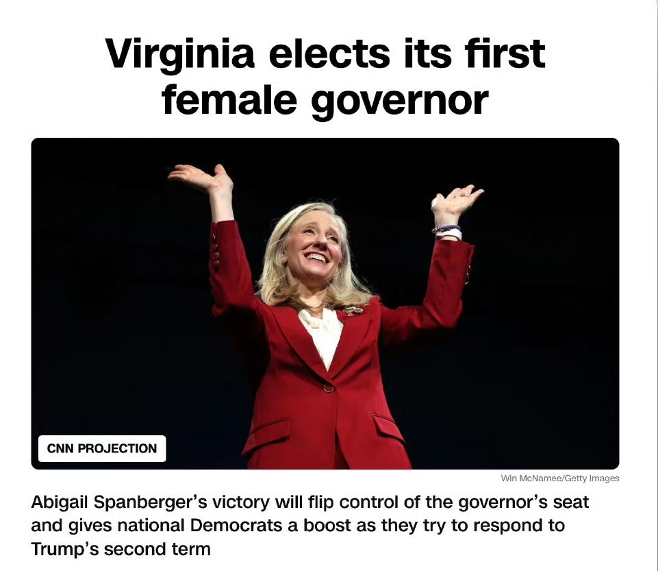 美国今天的几场重要选举,民主党实现全面横扫。 民主党人阿比盖尔·斯潘伯格当选弗吉尼亚州州长,她击败了击败共和党人希尔斯成为弗吉尼亚州首位女州长。 新泽西州州长选举结果,民主党人谢里尔战胜共和党人杰克·恰塔雷利,当选新泽西州州长。 纽约市长是特朗普极力反对的 Mamdani 即将当选。