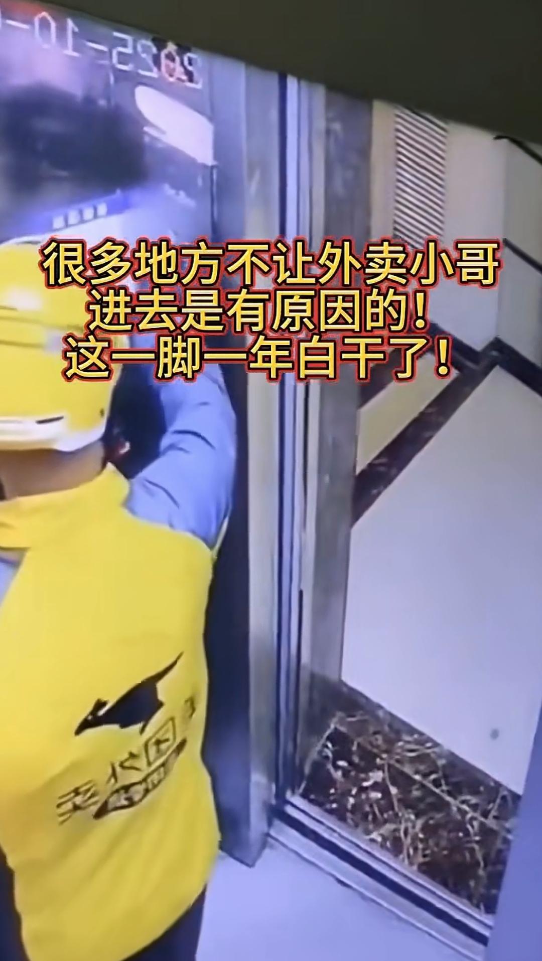 刚刷到一个电梯监控视频,封面写着:很多地方不让外卖员进电梯是有原因的。 监控视频显示: 一外卖员进入电梯按下楼层,这都挺正常的。 然而,在电梯门即将合上之际,外卖员把脚放电梯门中间,不让电梯门关上。 脚一直放着,门一直合不上。 这期间,外卖员在刷着手机,估计是看下个订单,会不会来得及。 也许是,脚一直这样放在门口有点酸,外卖员将脚给收回,电梯门没有阻挡又开始合上。 就在门即将合上之际,外卖员突然飞起一脚踹向电梯门,这一脚力道不轻,直接将正在合上的门给干熄火了,停在那里一动不动。 左右两侧门刚好就留一个脚掌宽的缝,人也出不去。 这时,外卖员开始紧张了,偿次推了几次电梯门,这电梯门仿佛是在报复他,停在原地一动不动,根本推不动。 这下好了,下个单子肯定是来不及了,自己跑又跑不了! 没办法,只能打求救电话了。 网友:他这一脚一年白干。 于是乎有不少人说:很多地方不让外卖员进电梯是有原因的。 其实,我想说的是:这只是个人行为,他不能代表所有外卖员,他没素质,是他个人没素质,不是外卖员没素质。 现在外卖员整体素质是挺高的,有大专本科生,甚至不乏博士硕士生,可以说是卧虎藏龙,高手如云。 所以,不能以点盖面,一棍子打死一大片,能给外卖员行方便就高抬贵手,毕竟大家都不容易,正常坐电梯,它是不会坏的。 你们觉得呢,欢迎留言评论。