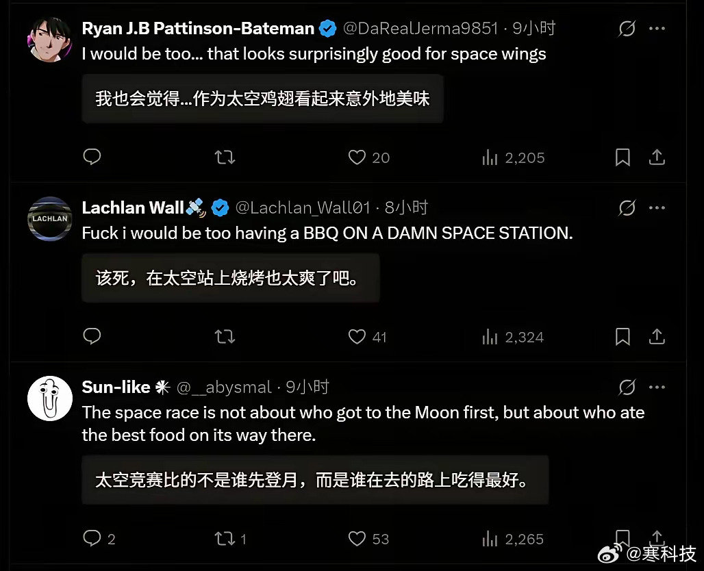 隔壁老外都馋哭了![滑稽笑]吱吱冒油!航天员在太空烤的鸡翅也太香了!不仅有鸡翅还