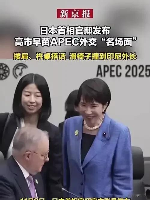 高市早苗外交名场面遭群嘲:这是峰会还是饭局? APEC会场成了她的“秀场”:滑椅子凑印尼总统,搭智利总统肩膀7秒不放,连特朗普夸两句都激动转圈。各国政要满脸尴尬,日本网友怒批“像居酒屋拉家常,丢尽国家颜面”。这场刻意刷脸的无边界外交,终究成了国际笑谈。高木早苗