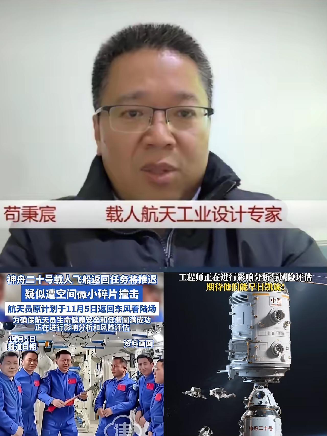 载人航天专家苟秉宸面对媒体采访时说: 虽然我们的飞船可能被太空碎片撞击了,但是航天员生命安全是有保障的。因为在太空 有两艘飞船待命,航天员安全绝对有保障。而且神舟21号刚送了够吃几个月的物资,压根不愁补给问题。 很多人担心碎片撞击的危害,其实关键在撞哪儿。 现在最要紧的就是找撞击点,摄像头没拍到的话,航天员可能就得出舱检查,这操作看着惊险,却是我们早有预案的应对方式。 要知道,我们连太阳翼被撞击都能在轨修好,这种排查修复能力早就练过了。 所谓的“突发状况”,其实都在层层防护网里。从天上的双船备份到地面的应急方案,每一步都留了后手。 你觉得这次撞击会是小擦伤吗?你还知道哪些中国航天的“安全黑科技”?来评论区聊聊~