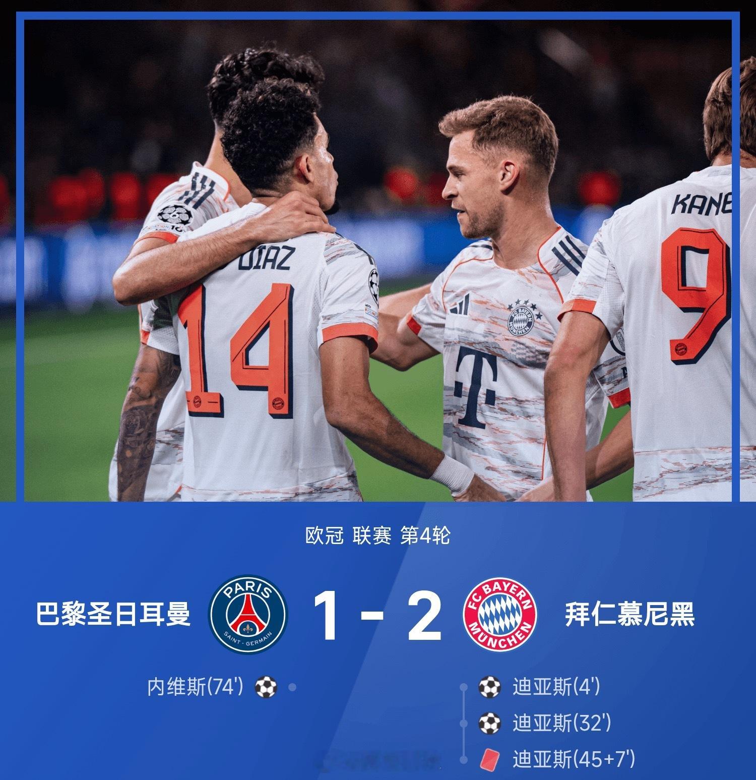 25/26赛季欧冠联赛第4轮,拜仁慕尼黑客场以2-1力克巴黎圣日耳曼。上半时比赛,迪亚斯贡献双响,但半场结束前他染红离场,令拜仁仅剩10人应战;下半时比赛,内维斯为大巴黎追回一球。拜仁在获得这场比赛后,在各项赛事的前16场取得全胜,延续着彪炳的竞技状态。巴黎圣日耳曼vs拜仁慕尼黑欧冠杯