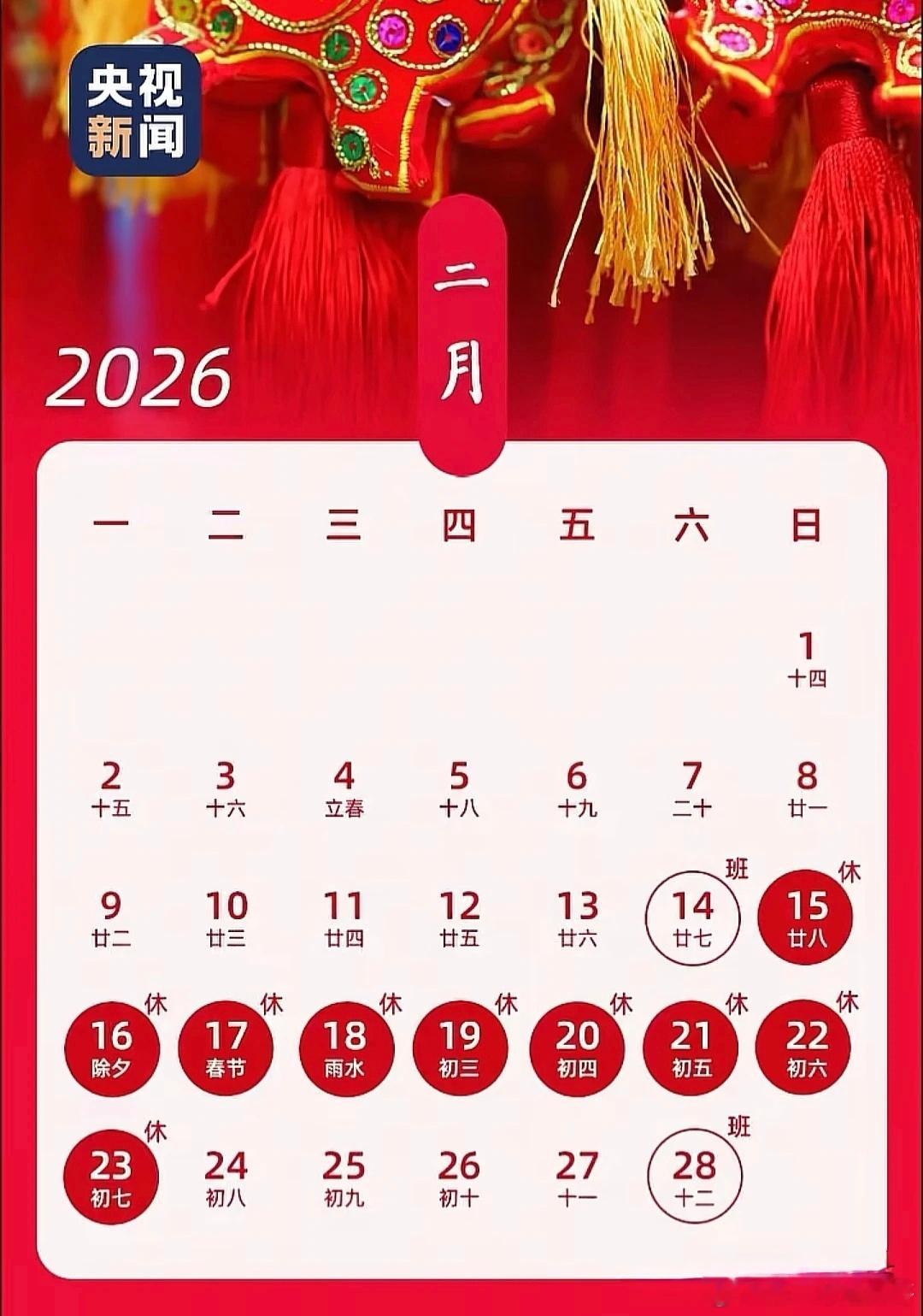 根据国务院办公厅通知,2026年春节2月15日(腊月二十八)至23日(正月初七)连休9天,调休安排明确为2月14日(周六)、2月28日(周六)两个周六上班补假 。