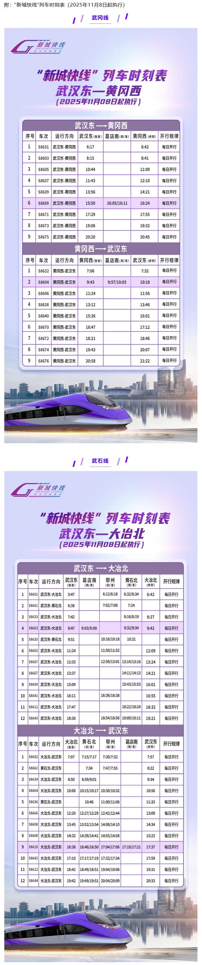 “新城快线”葛店南站开办客运业务 11月5日,湖北铁路集团轨道运营有限公司发布了“新城快线”葛店南站开办客运业务的公告,“新城快线”葛店南站将于2025年11月8日正式开始办理客运业务,每日有4列“新城快线”列车停靠葛店南站。