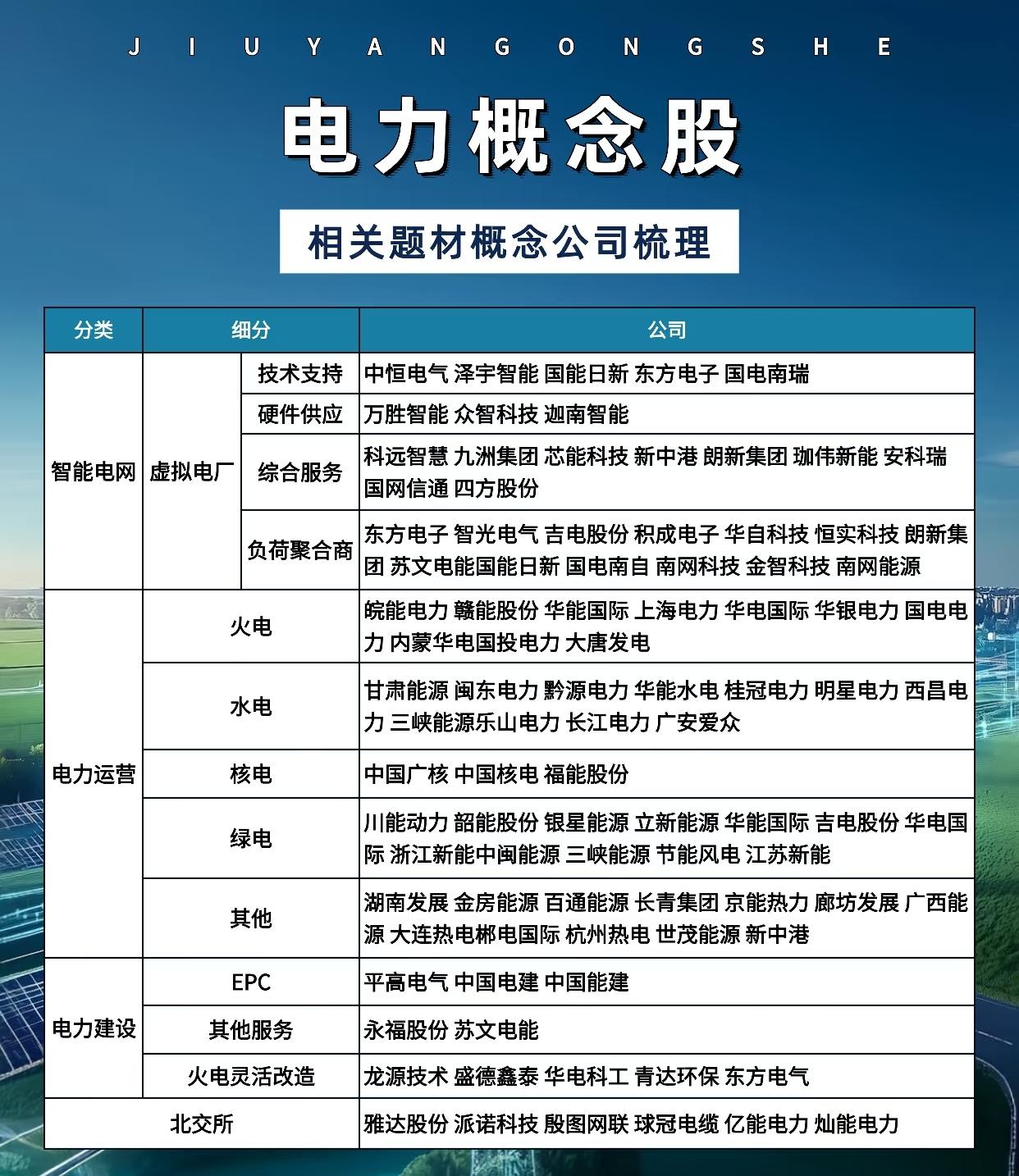 关于“电力概念股”的信息图表,主要梳理了与电力行业相关的各类题材及对应的上市公司,旨在帮助了解电力产业链中不同细分领域的代表企业。 第一张图聚焦于“电力设备”和“智能电网”两大分类。在“电力设备”中,又细分为变压器、绝缘子、智能电表等,每个细分领域都列举了多家代表性公司,比如变压器领域有思源电气、三变科技、特变电工等,绝缘子有大连电瓷、神马电力,智能电表包括科陆电子、九洲集团、炬华科技等。在“智能电网”中,进一步细分为输变配电(输电、变电、配电)和用户侧,其中用户侧又包含智能电表、计量终端、通信模块、外置断路器、智能调度等细分,相关公司有平高电气、国电南瑞、许继电气、三星医疗、林洋能源、正泰电器、远光软件等。 第二张图扩展了分类范围,除了继续涵盖智能电网外,还新增了电力运营、电力建设、北交所等分类。在“智能电网”中特别提到了“虚拟电厂”,并细分为技术支持、硬件供应、综合服务、负荷聚合商等,相关企业包括中恒电气、万胜智能、科远智慧、东方电子等。在“电力运营”中,分为火电、水电、核电、绿电及其他类别,列举了华能国际、长江电力、中国核电、川能动力、湖南发展等众多公司。在“电力建设”中,分为EPC和其他服务,有平高电气、中国电建、永福股份、苏文电能等。“北交所”部分则列出了雅达股份、派诺科技、球冠电缆等在该板块上市的电力相关公司。 整体来看,系统地整理了电力行业从设备制造、电网智能化、电力生产运营到电力建设服务等多个细分方向的主要上市公司,为了解电力产业布局和投资方向提供了较为全面的参考。