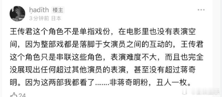另一方面,王传君果然如传闻所说拿下了东京影帝,即便这个影帝也不算很有含金量,之前男星拿了戛纳柏林威尼斯影帝也没多火,而拿过东京电影节影帝的王千源、王景春和段奕宏等,也没吃到多少红利,也没因此名声大噪。所以这个奖项对王传君意义不大,他的演技无可厚非,只是这次这个男主角当得憋屈,戏份比女主角甚至女二号都少很多,却拿奖了。如果是肯定演技还好,但如果真的是因为力保影帝让白百何出局,那确实有点不公平。
