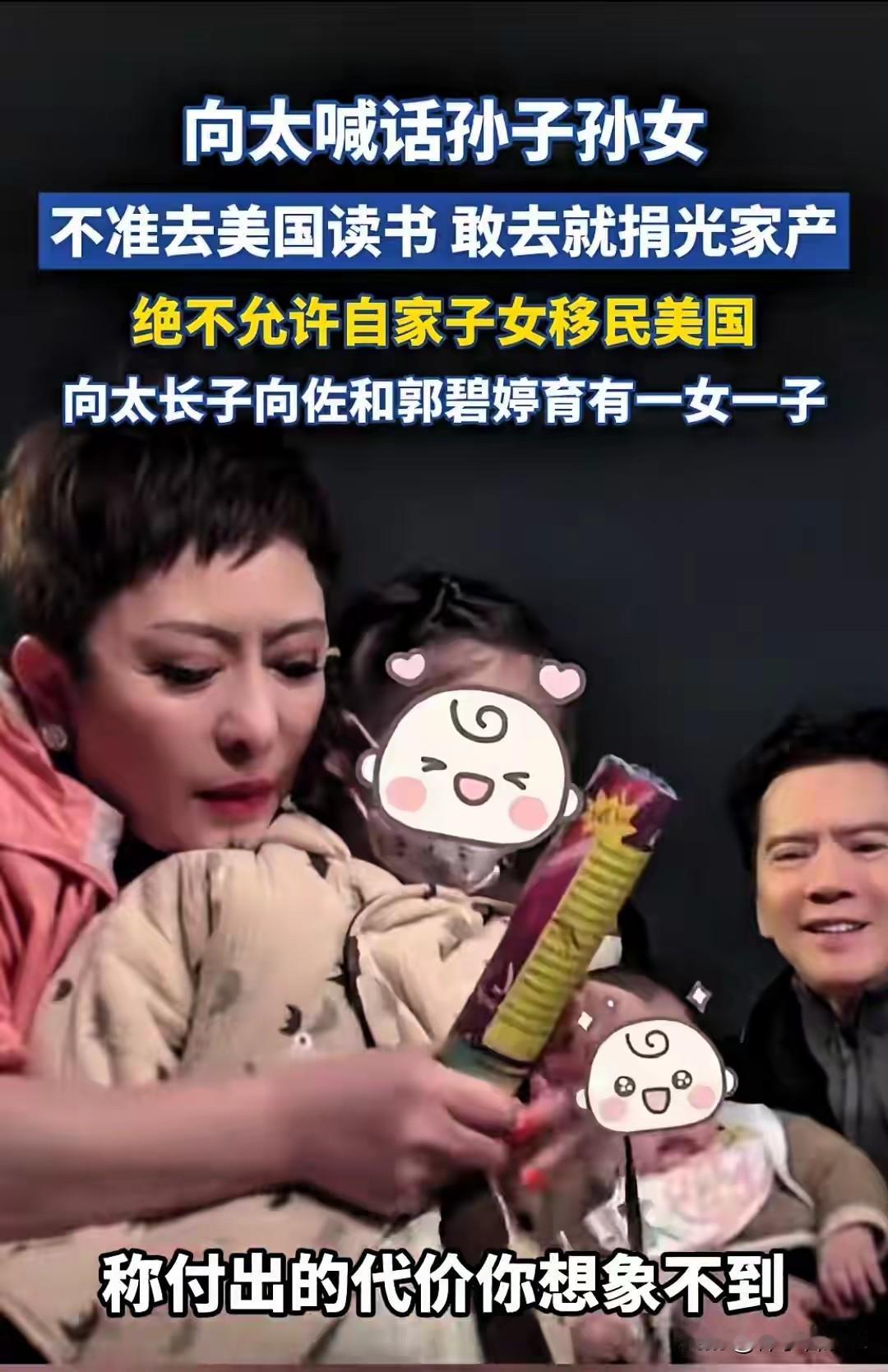 2025年11月4日,向太陈岚在社交媒体发布视频,以“捐光32亿家产”为筹码,明确禁止子女移民美国、孙辈赴美留学,并直言“代价超乎想象”。这一表态迅速引发舆论热议,其背后的动机可从安全风险、财富传承、代际控制及舆论策略四个维度展开分析。安全风险:美国社会乱象触目惊心。向太在视频中直指美国治安恶化,称“街头乞丐、流浪汉、瘾君子泛滥”,并举例久居美国的富豪友人因遭遇抢劫而搬离。这一描述并非空穴来风: