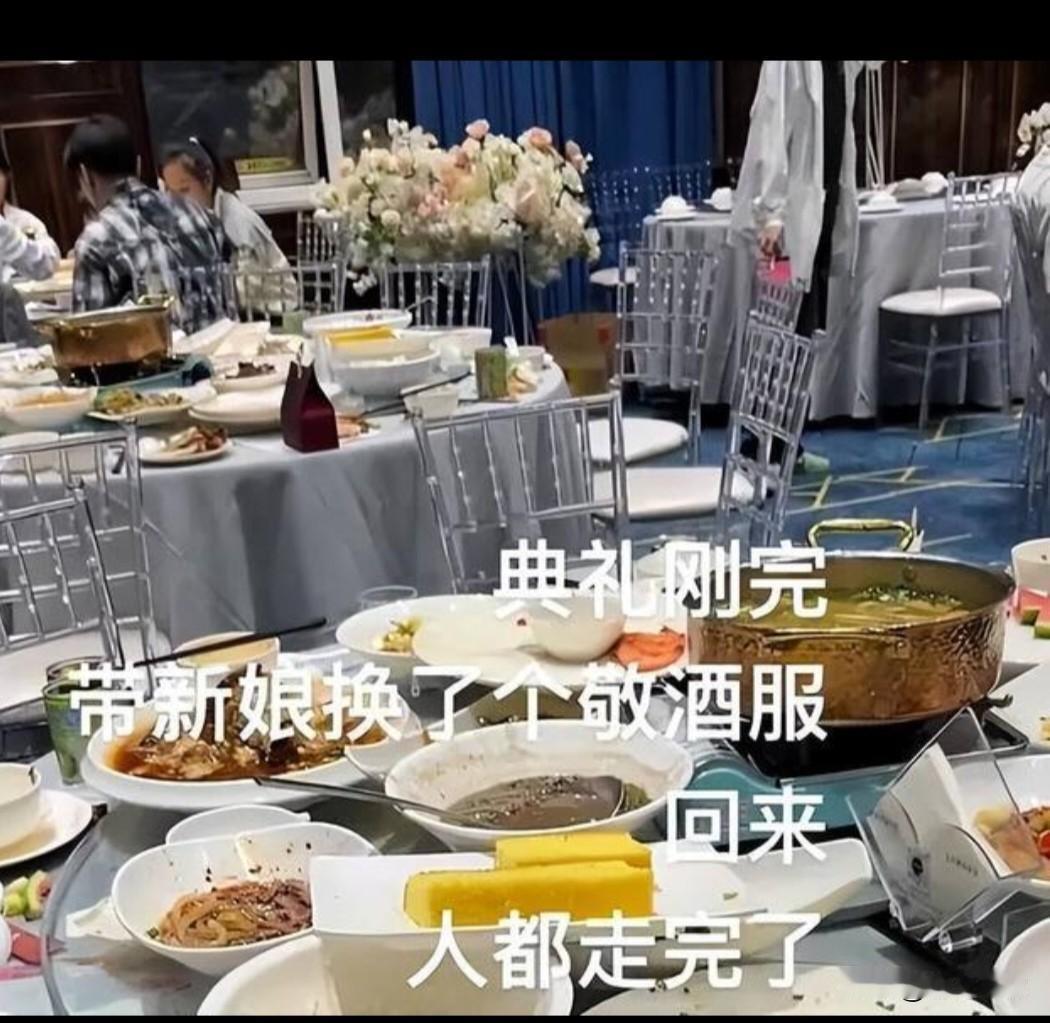 新娘半小时换装回来,22 桌宾客基本都走空了。这场婚礼堪称现实版的社死现场。撕开的是人情往来的遮羞布。 在贵州遵义,当新娘换上精心准备的敬酒服,带着酒杯重返宴会厅时,原本座无虚席的22桌酒席几乎都走完了,只剩下满桌残羹冷炙和孤独播放的情歌。 再一次证明,你的婚礼就算再豪华,再有仪式感,你们的甜蜜记录,爱情宣言,婚纱好不好看,场面隆不隆重,也真的没几个人会在意,真心祝福从来都是奢侈品,满场几百宾客里真的为你喜极而泣的肯定凑不齐一桌。 内蒙网友说,是真的,我外甥今年结婚就是,三套衣服,等她换完出来,亲戚走的连一个人都没有,就我们几个亲姨,在等她! 宾客是为了人情世故、礼尚往来,来是随份子吃席的,不是来看新娘的。 新娘长什么样,穿什么衣服,宾客根本就不感兴趣。 大家去吃席,有的是为了面子,有的是去还账,大家只关心快上菜,快吃完回家! 还有网友吐槽,如今的婚宴成了“打卡式社交”,随个份子、吃顿饭,就算是完成人情往来,谁还乐意等后面的环节呢? 有人说:“宾客不会记得婚礼是否隆重,但会记住菜品好不好吃!