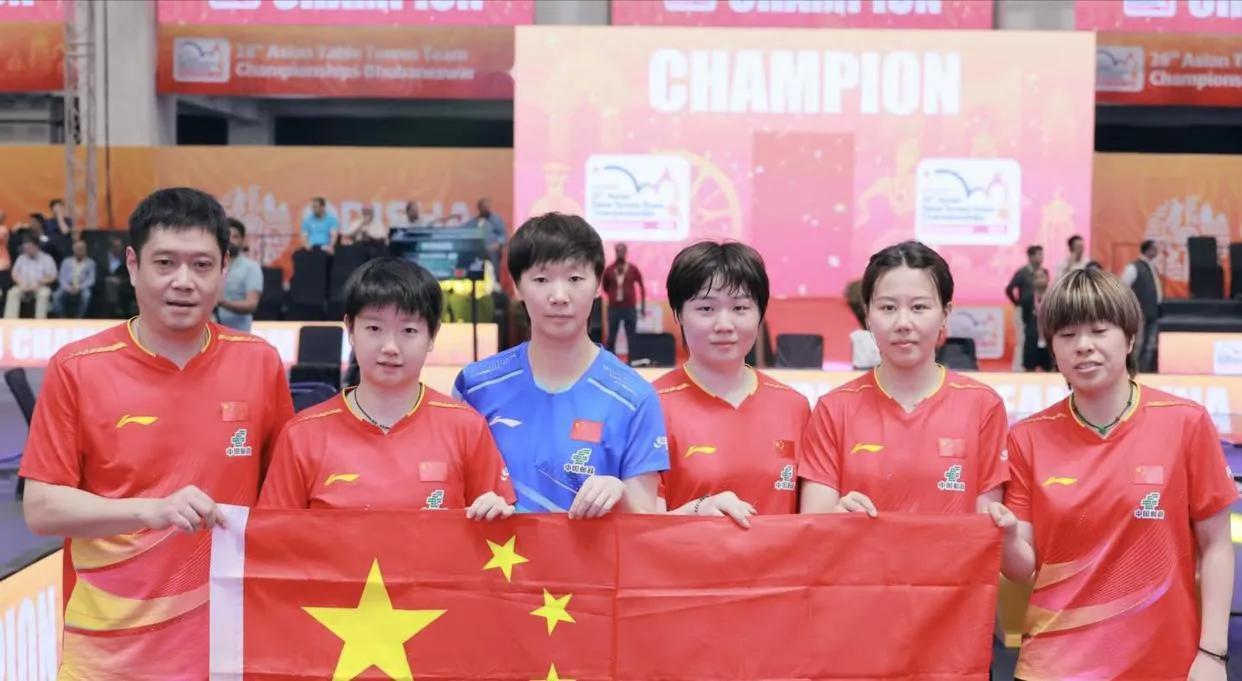 5位女乒名将与教练手擎国旗的合照好亮眼:可是我只认出了可爱的孙颖莎,高挑的王曼昱,微胖的蒯曼与陈幸同,当然还有教练邱贻可,最右侧那位金发闭眼的是谁?
