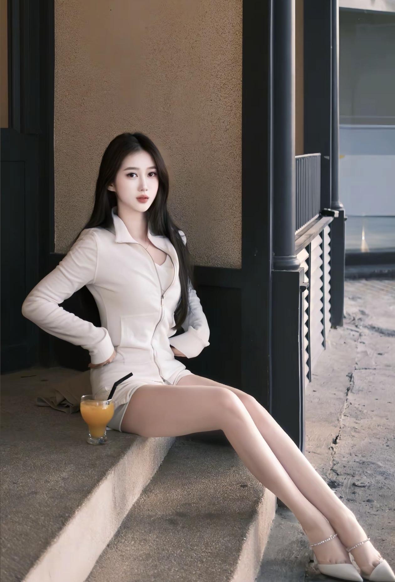 优雅白裙少女,静坐咖啡馆台阶,享受悠闲时光。