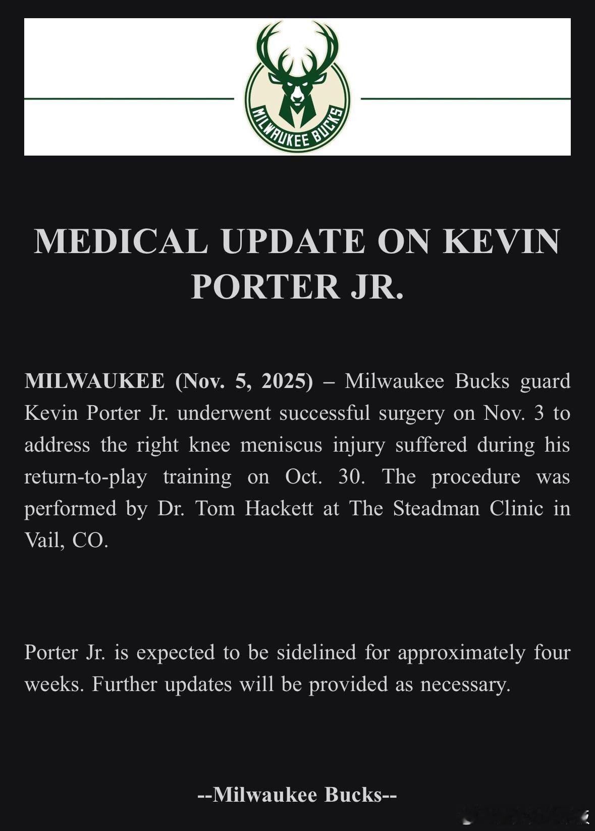 雄鹿官方宣布,小凯文-波特已于11月3日接受右膝半月板损伤修复手术,这次受伤是在上10月30日他复出训练期间不慎造成的🤕