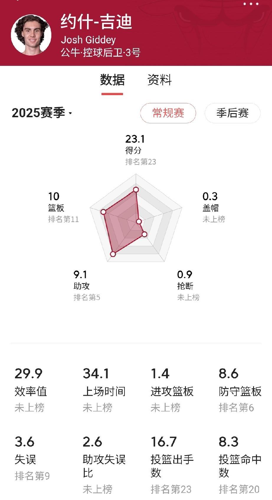 东部黑马之争,公牛力压76人获胜重新登顶榜首,吉迪巩固在公牛队的核心地位。 公牛上赛季拿卡鲁索和雷霆交换吉迪,真是实现4赢,卡鲁索力助雷霆夺取总冠军。吉迪成为公牛组织核心和建队基石。上赛季吉迪场均14.6分8.1板7.2助,力助公牛杀入附加赛,最后不敌热火,功亏一篑。本赛季吉迪更进一层楼,带领公牛成为赛季初的联盟黑马,先是开赛5连胜,坐稳东部赛区榜首。但上轮客场不敌尼克斯,迎来赛季首败。本场在和76人的东部头名之争中,公牛笑到最后,在最多落后24分情况下实现大逆转战败对手。吉迪出场37分钟拿下29分15板12助,他的出色发挥让76人控卫马克西竭力砍下的39分5板5助豪华数据变得没有意义。 吉迪连续两场比赛拿到三双,本赛季场均23.1分10板9.1助,俨然有荣登东部第一后卫宝座的趋势。