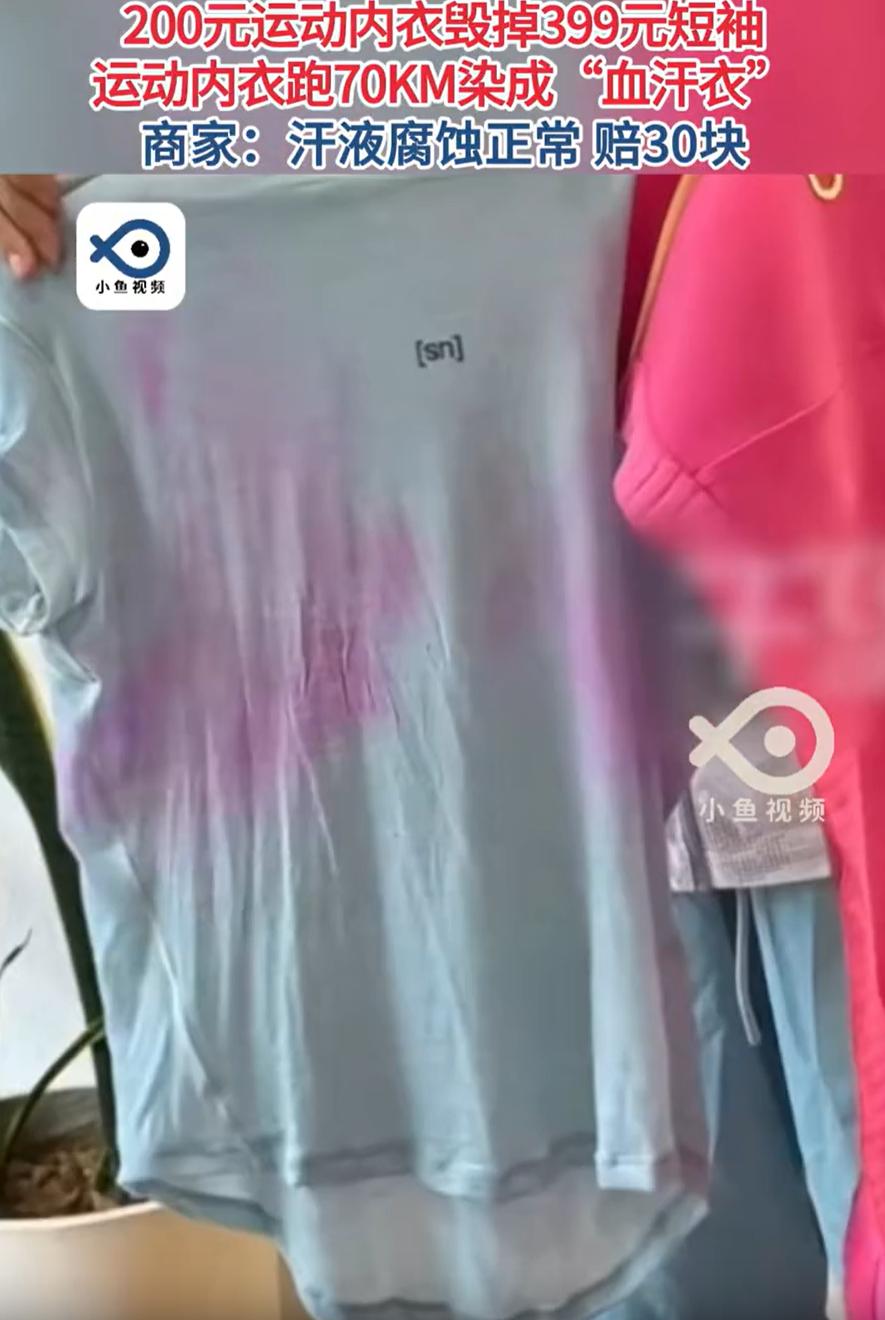 “这下尴尬了!”浙江杭州,女子去参加70公里越野赛,可跑到终点后却发现,胸前的衣服上竟然变成了粉色,而且只有胸前的一块,找到原因是当天穿的粉色运动内衣掉色了,可找到商家,对方却表示:汗液腐蚀正常,可以赔30元! 杭州一位运动爱好者在跑完70公里越野赛后,迎来了一场始料未及的尴尬。 冲过终点线的她被周围人的目光紧盯,低头一看才发现,胸前的白色短袖晕开大片粉红,起初还以为是皮肤意外划破,仔细检查后才弄清真相——是里面那件200多元的粉色运动内衣掉了色。 这件被染色的短袖价值399元,如今两件衣物都因染色问题彻底失去了正常使用价值,让她在公众场合陷入难堪境地。 遭遇衣物染色后,这位女子第一时间联系了运动内衣品牌方飞比特寻求解决方案。 她明确提出了退款以及赔偿受损短袖的诉求,同时指出这款内衣此前经过洗衣机清洗都未出现掉色情况,此次是首次在运动场景中穿着就出现问题,质疑品牌“流汗不闷汗”的宣传存在虚假成分,且从未提示过衣物可能出现的染色风险。 在与品牌客服沟通无果后,她选择向消费者协会提交投诉,坚持维护自己的基本消费权益。 可她的维权之路并不顺畅,律师表示,虽然从法律层面她可以依据消费者权益保护法主张商家虚假宣传,但诉讼流程复杂且耗时费力,这也是多数消费者遇到类似问题时被迫忍气吞声的主要原因。 面对消费者的合理诉求,品牌方的应对尽显推诿与敷衍。 初期客服以“汗液腐蚀属于正常现象”为由拒绝承认产品质量问题,后来又补充“商品已过售后期”的说法,始终只愿意提供30元的小额补偿。 在女子通过社交平台曝光事件后,品牌方曾承诺只要她删除帖子就会妥善处理,可事后却并未兑现承诺。 直到事件登上热搜引发广泛争议,品牌方才在深夜发布声明,仅承认未提前充分提示风险,用“高概率出现染色”这样的表述替代“产品存在质量缺陷”,试图将责任转移到消费者“未注意提示”上,声明中未提及具体的赔偿方案,仅模糊表示会“妥善处理”。 这场看似偶然的衣物染色事件,实则揭开了行业内长期存在的诸多沉疴。 衣物掉色并非个例,而是普遍存在的消费问题,无论价格高低的衣物都可能出现此类情况,其中牛仔裤更是掉色“重灾区”,清洗时染色现象尤为突出,场景也从运动出汗延伸到日常衣物清洗。 更值得警惕的是,运动服装色牢度的国家标准仅适用于日常洗涤场景,并未涵盖超长距离越野这类特殊使用场景,这就导致商家即便按照现有标准生产,也可能在极端情况下引发纠纷,而消费者往往需要自行承担风险。 同时,电商平台“超时即拒赔”的僵化售后规则,也让许多消费者在遇到质量问题时维权无门。 事件曝光后,网友和行业人士纷纷表达了自己的观点。 不少网友质疑,一款专业的运动内衣连汗水的考验都经受不住,显然违背了其专业属性,消费者花高价购买专业运动装备,期待的是它在剧烈运动中能保持稳定性能,品质才是核心价值所在。 今天的分享到这里就结束了,大家对此事有何看法,欢迎在评论区留言和讨论,感兴趣的可以点击头像加关注,我将每日更新优质内容,我们下期见。