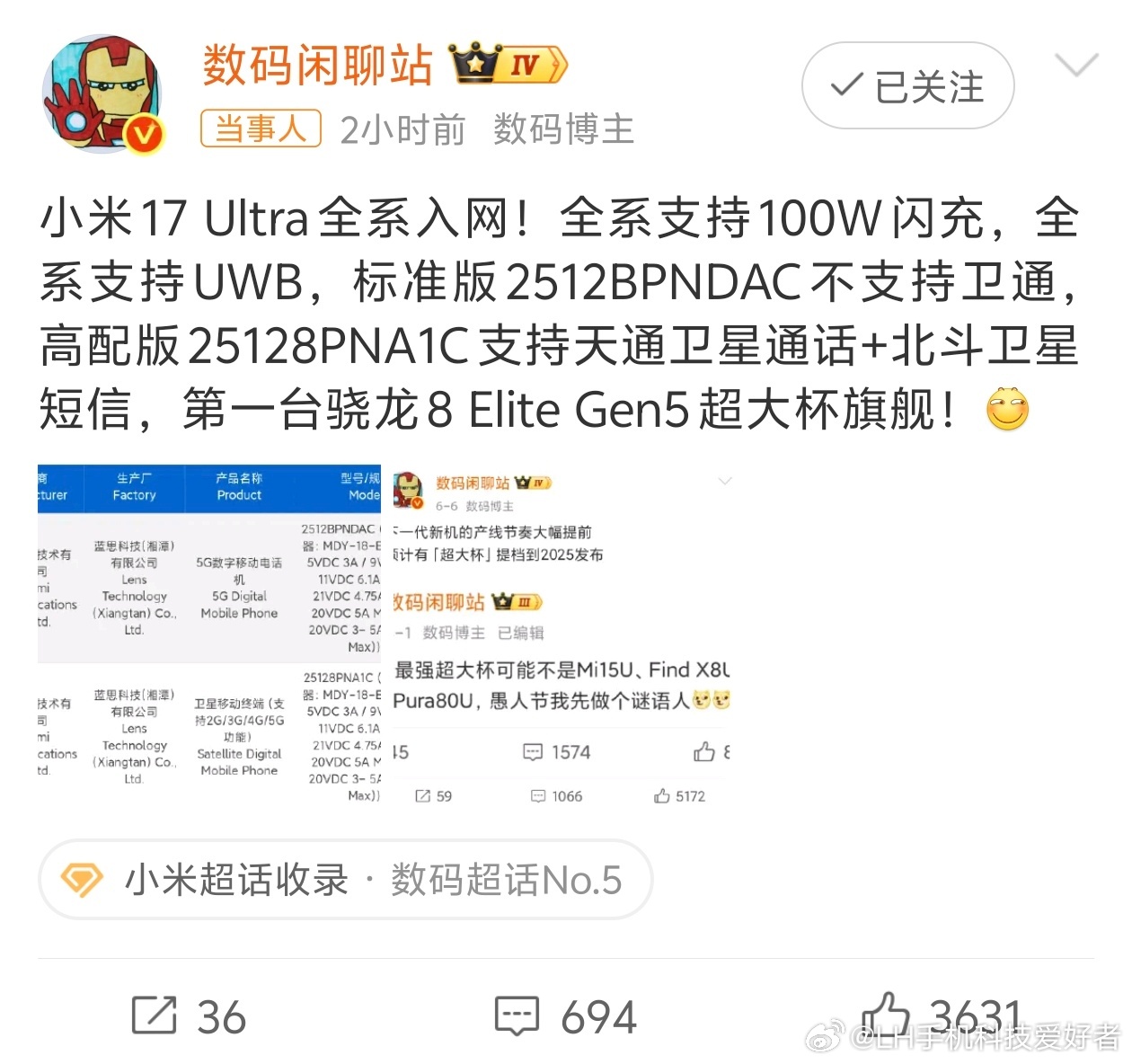 小米17Ultra通过3C认证小米的节奏很快啊,小米17 Ultra已经通过认证了,除了第五代高通骁龙8至尊版芯片,还有全系100W闪充,全系支持UWB,这个好啊。不过,卫星通信不是标配,我觉得也没啥问题,只要价格到位就行。