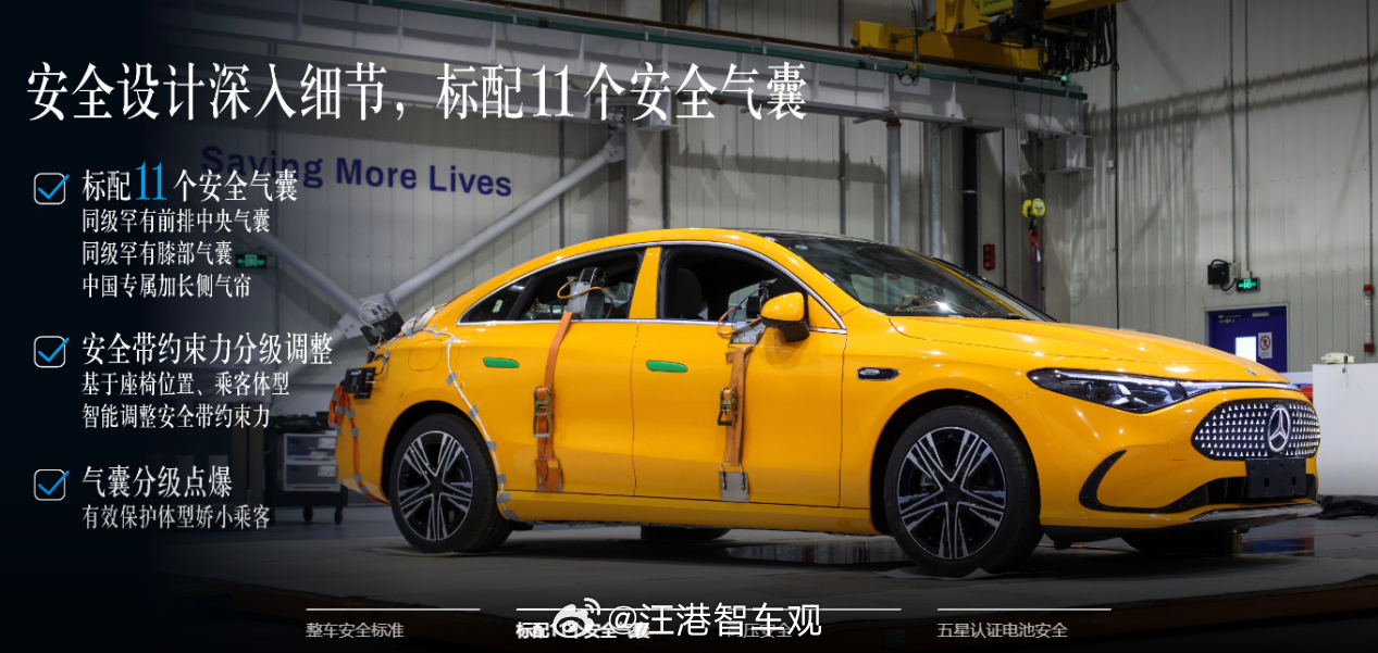 除此之外,全新奔驰纯电CLA标配11个安全气囊,通过了中国电动汽车火灾安全指数测评五星认证、NESTA 整车电安全专项验证测试、中汽中心“EMTA 人体健康 防护之星”认证等多个权威机构的测试认证。