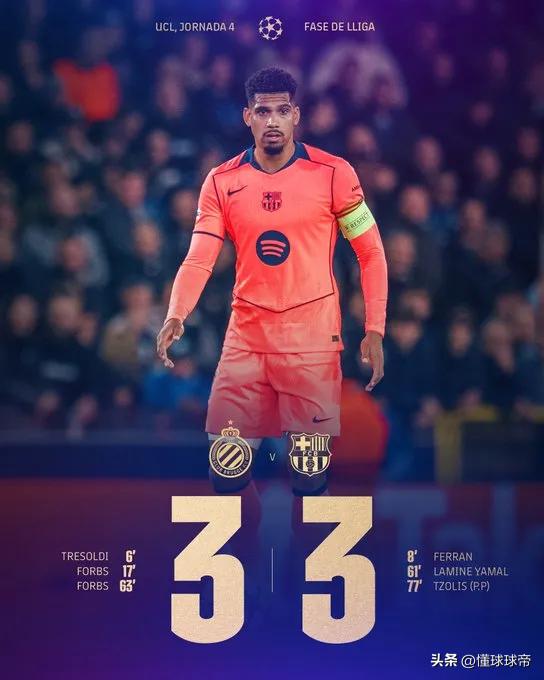 阴沟里翻船了,巴萨3-3爆冷被鱼腩球队逼平! 在本轮欧冠联赛中,巴萨客场迎战比甲球队布鲁日,本以为巴萨可以轻松拿捏轻取三分,万万没想到却阴沟里翻船了。 上半场,布鲁日球员率先破门,随后巴萨的费兰-托雷斯接费尔明助攻迅速扳平,但是布鲁日马上就再次进球将比分超出,上半场结束时巴萨1-2落后。 下半场,亚马尔接费尔明助攻打进一球扳平比分,但是没想到巴萨的后防几乎不设防,布鲁日球员再次破门反超比分,比赛最后时刻亚马尔造布鲁日球员乌龙绝平,最终巴萨3-3布鲁日,排名第11位。 巴萨的后防真的是一言难尽,要不是亚马尔天神下凡,巴萨要被吊打了,恩里克的防守没点战术,进几个球就丢几个球,这样的巴萨皇马已经放心了。