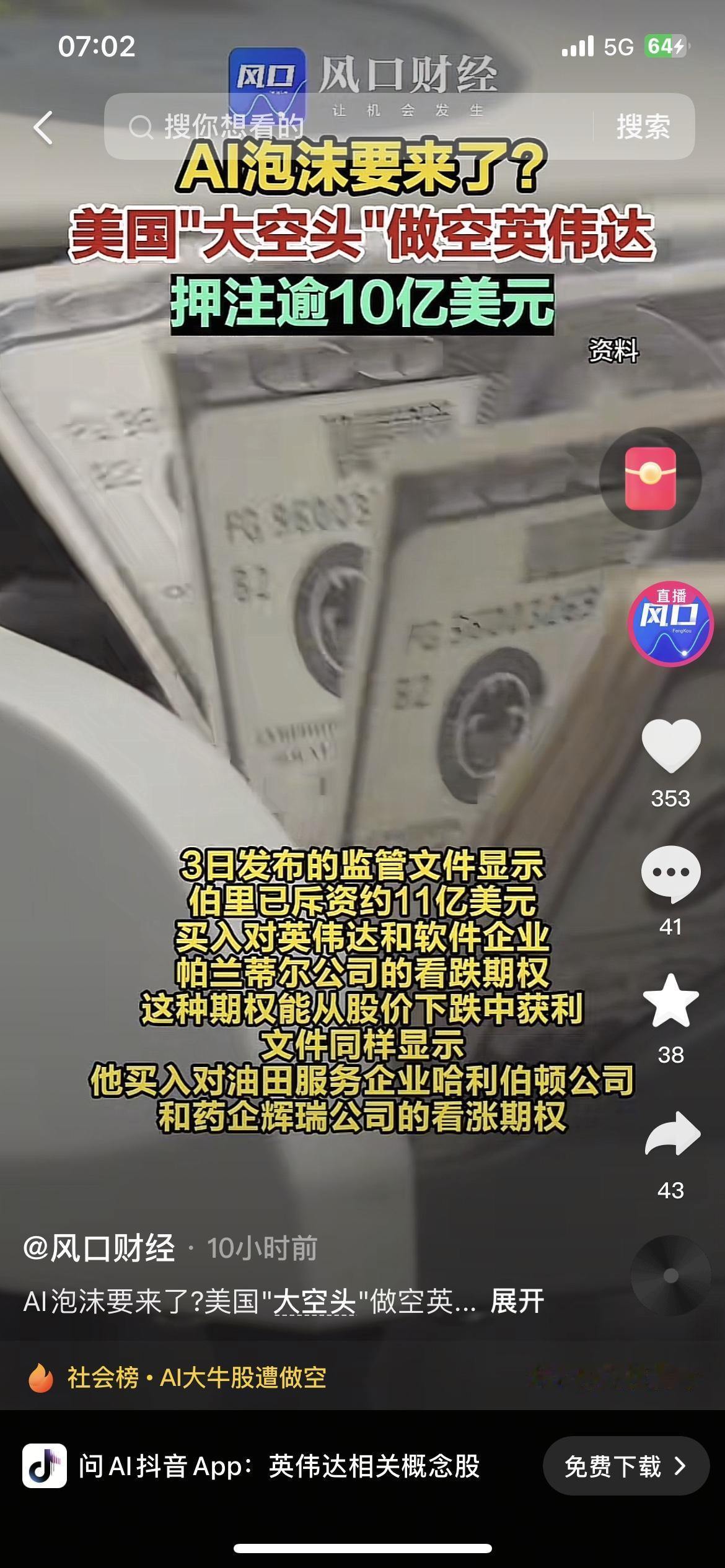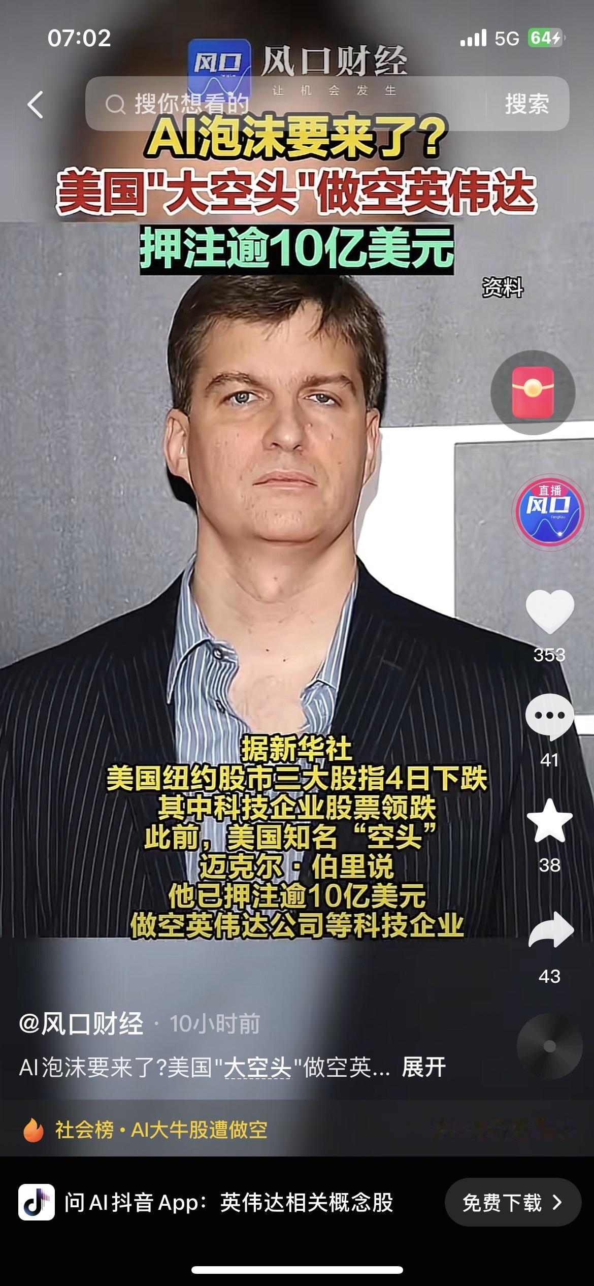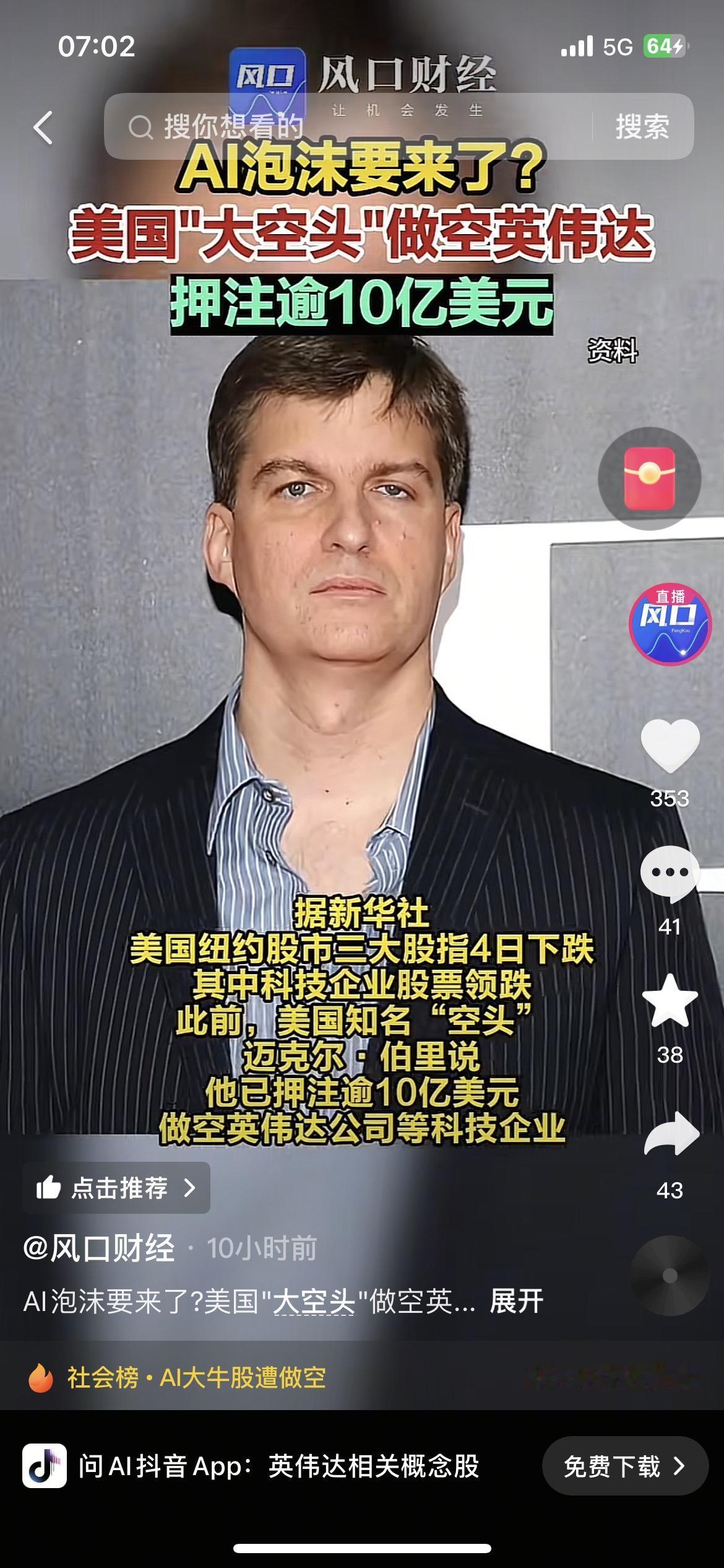 大空头押10亿做空英伟达!AI泡沫要来了? 美国“大空头”迈克尔·伯里又出手了——斥资超10亿美元做空英伟达+帕兰蒂尔,这操作和当年赌美国房地产崩盘如出一辙! 英国媒体直接把当下AI热比作“互联网泡沫”,而英伟达作为AI算力“扛把子”,刚带火科技股,就被空头瞄准… 更有意思的是,这边美国在赌AI降温,那边香港刚砸出“双引擎战略”,要重点搞算力、算法六大AI支柱,还要联动大湾区做应用场景。 一边看空一边猛布局,AI到底是泡沫还是未来?AI泡沫