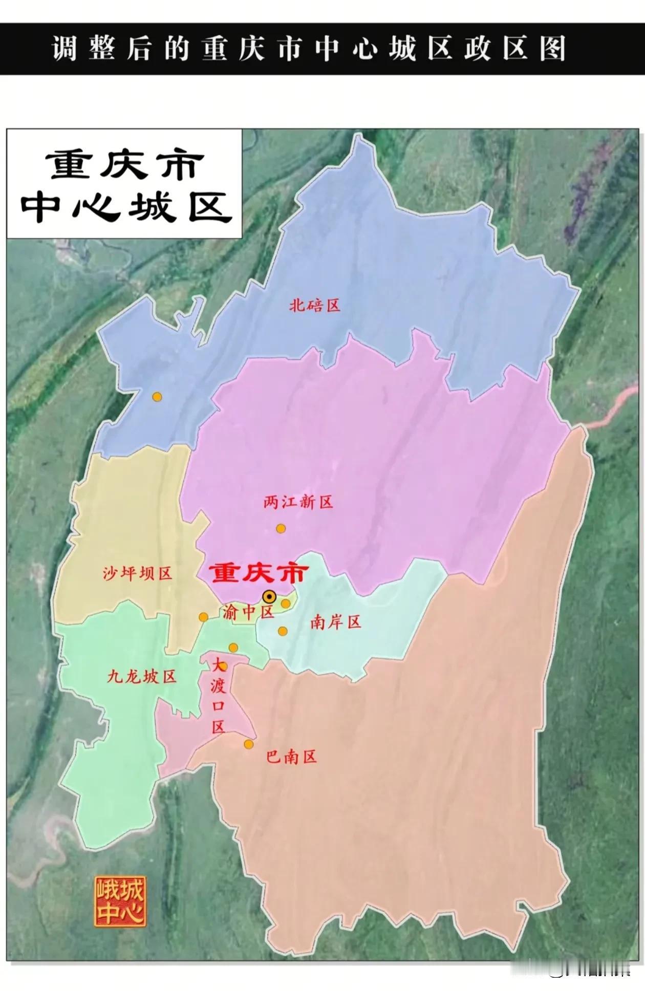 11月6日,重庆主城区进行了重大区划调整,江北区和渝北区,整合成新的两江新区。同时,把原渝北区的五个镇划给了北碚区。 这次区划调整之后,让两江新区一跃成为中西部第一区,人口超350万,GDP超5000亿。 看样子,两江新区未来是要对标天津滨海新区和上海浦东新区的,都是直辖市的重要功能区,成长为核心增长区。 重庆这次区划调整,给中西部其他城市打了个样。未来,武汉的长江新区,长沙的湘江新区,南昌的赣江新区也可以学习借鉴。尤其是武汉早日合并鄂州,南昌合并丰樟高等,可以提上日程了。重庆城区地图 重庆微调 重庆行政区划