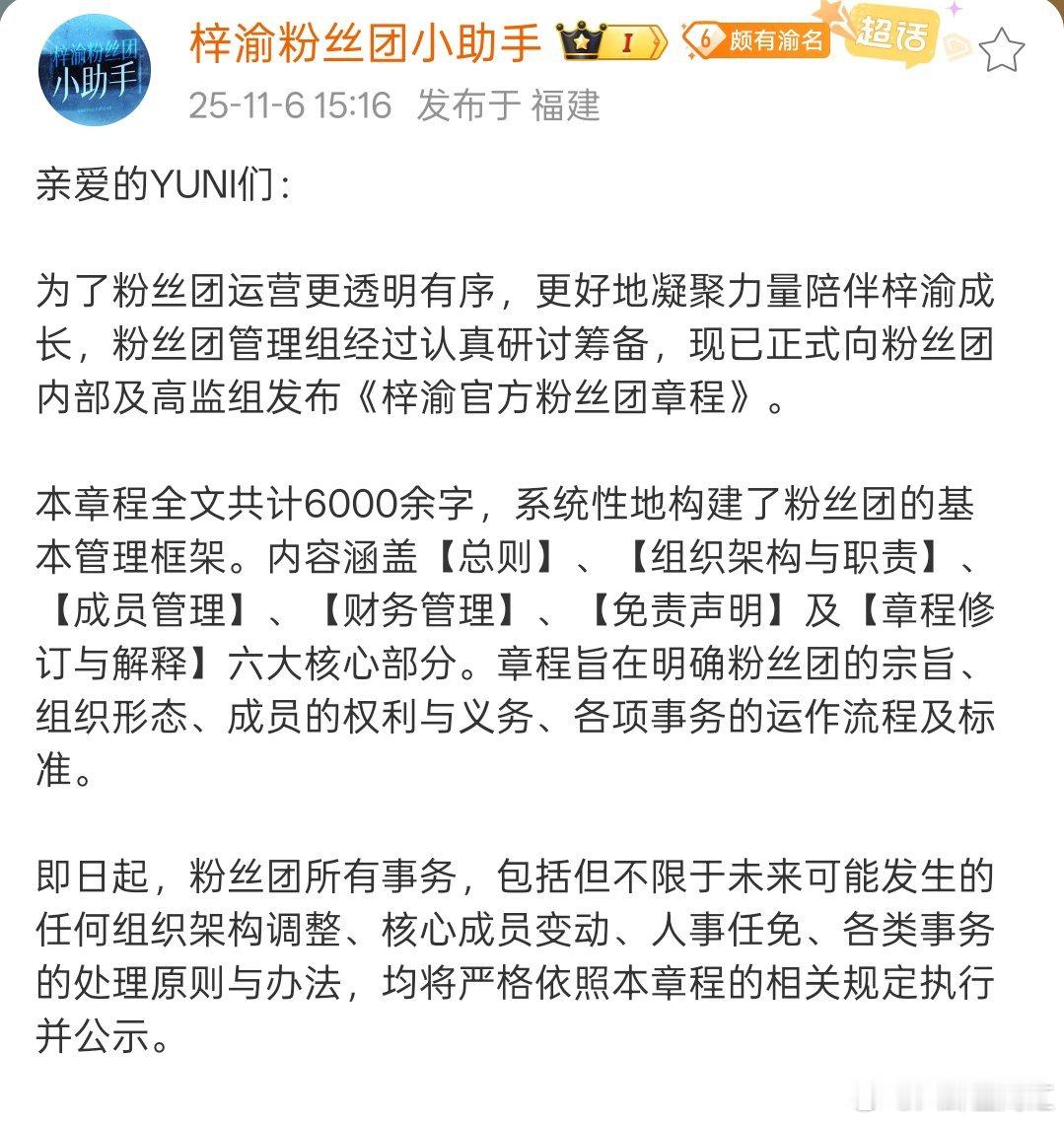 梓渝官方粉丝团章程梓渝粉丝团章程天呢。梓渝后援会也太正式了,为了粉丝团运营更透明有序,正式向粉丝团内部及高监组发布《梓渝官方粉丝团章程》。