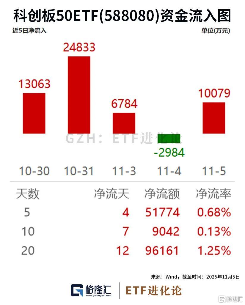 此外,规模超700亿的科创板50ETF(588080)获资金流入,10月9日-11月5日累计下跌7%之际,期内资金净流入9.62亿元。