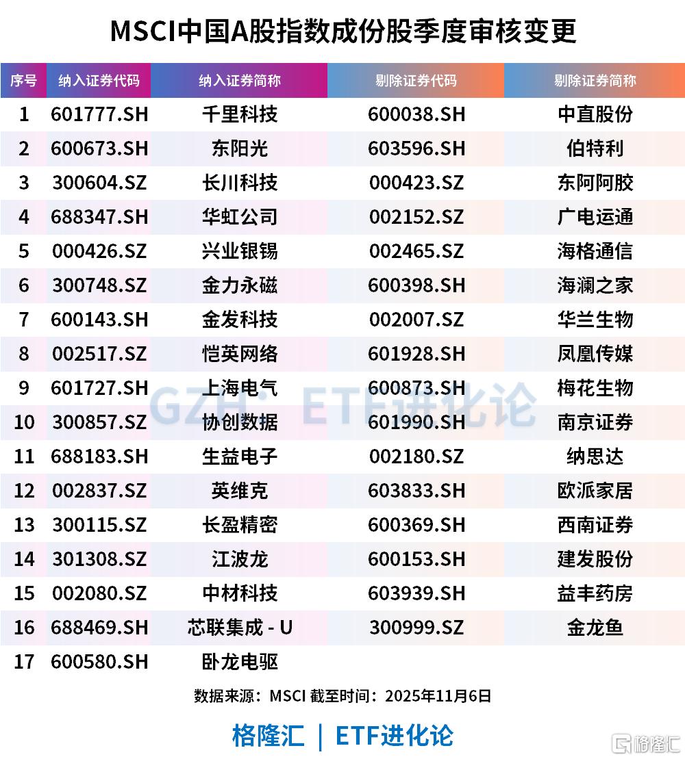 具体来看,MSCI中国指数新纳入17只A股,9只港股,剔除16只A股和4只港股。如新纳入的半导体制造龙头华虹公司、存储芯片设计企业江波龙、半导体测试设备供应商长川科技、功率半导体龙头芯联集成等。