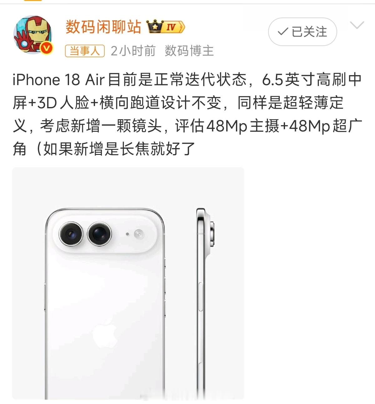 iPhoneAir2或新增1颗镜头本来Air的销量就不咋行,现在好了,都等Air