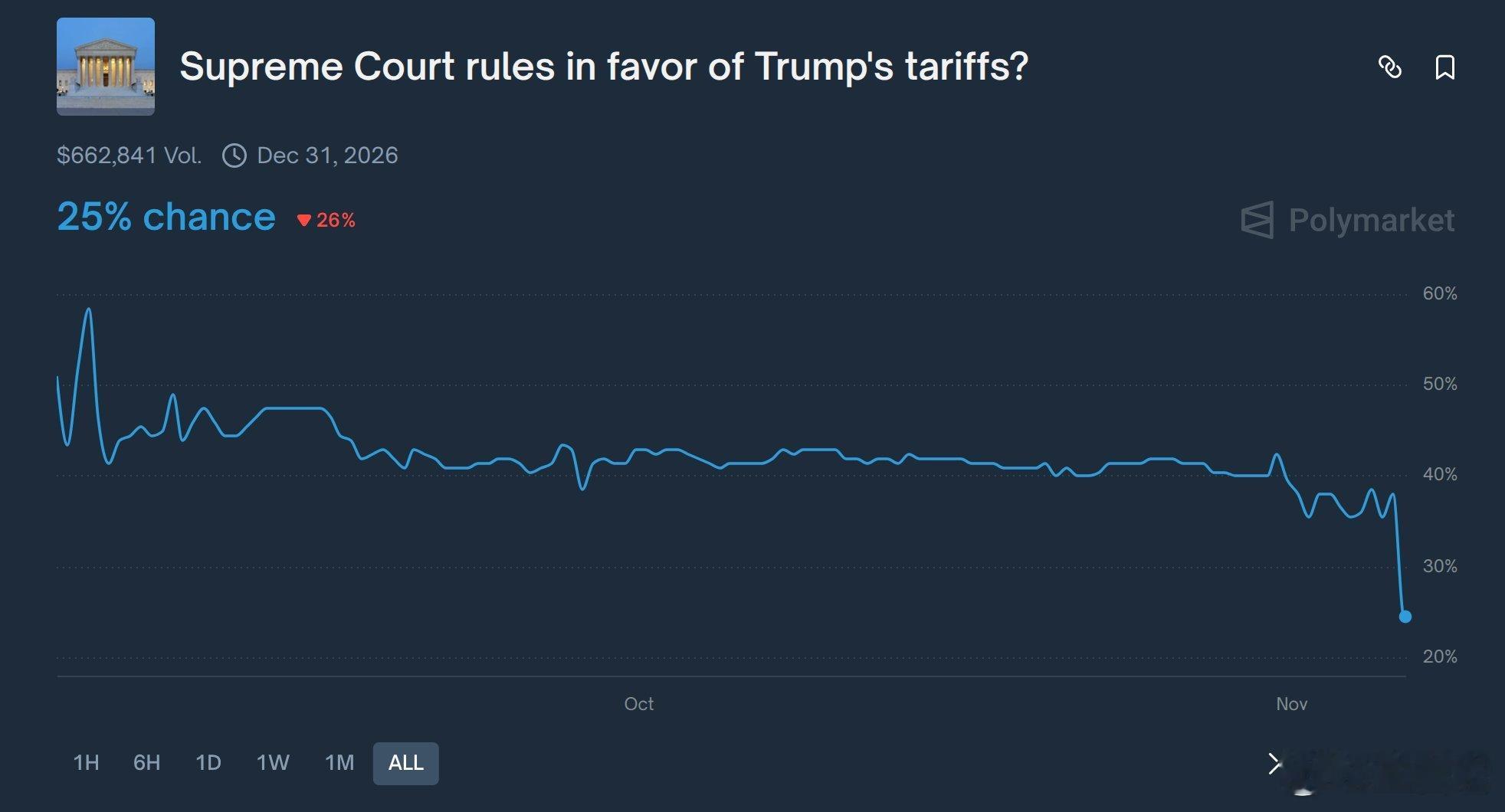 ‼️ 最高法院辩论后,川普政府关税失败率在预测市场里大增。