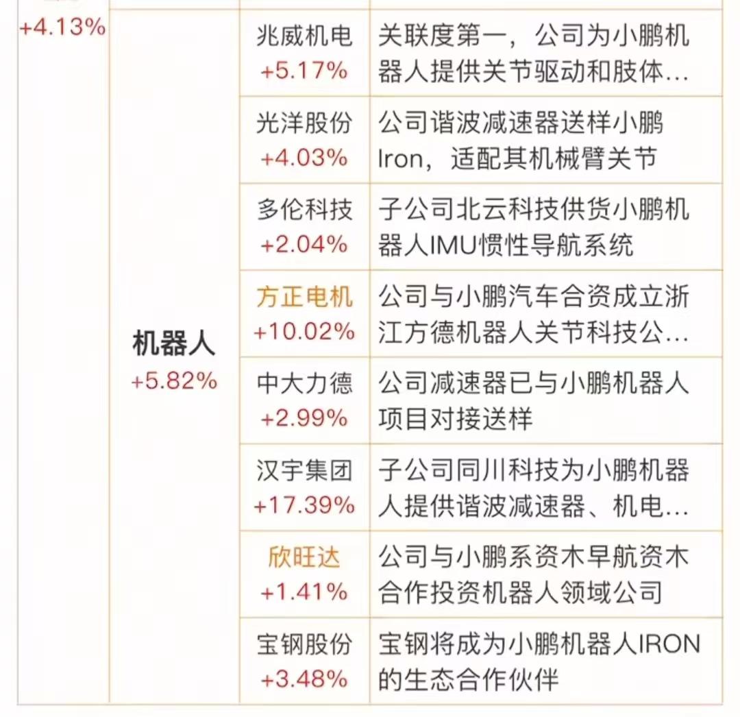 新题材“小鹏机器人”概念梳理! 题材概念驱动事件:2025年11月6日,在“2025小鹏科技日”上,小鹏发布了全新一代IRON人形机器人。因其步态轻盈丝滑、仿生人形细节逼真,被部分网友怀疑“皮套”中内藏真人!小鹏汽车美股当晚最大跌幅超过5%。 何小鹏明确2026年底实现规模量产,同时开放IRON的SDK邀开发者共建生态,还联手宝钢布局工业巡检场景!相关概念代表有哪些? 小鹏生态布局持续拓展,汽车与机器人领域双轨并进。汽车领域龙头代表有光洋股份、方正电机等;小鹏机器人领域关联度较高的公司有兆威机电、光洋股份、汉宇集团、宝钢股份等等。 理财有风险入市需谨慎,资料取材网络仅供参考!机器人产业大会