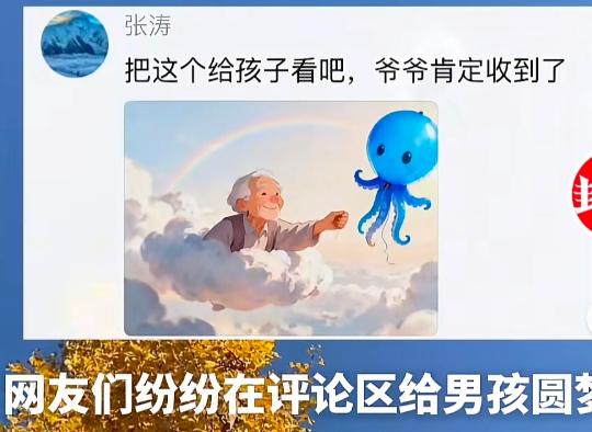 山东青岛一名女子带儿子到公园玩,女子给儿子买了一个氢气球,儿子刚玩了一会,就问女子要指甲剪,然后把氢气球的绳子剪断,女子看见后责怪儿子,但是看到孩子委屈的样子就缓和语气询问原因,没想到孩子的一句话让心头一酸,孩子说:“我想把气球送给在天上的爷爷。” 2025年11月初,青岛的午后,一位母亲领着儿子走进公园。   逛到中途,孩子的目光被路边小摊上的气球牢牢吸引,其中那只蓝色章鱼造型的,让他停下了脚步。   母亲看出孩子的喜爱,付了钱将气球递过去,孩子立刻紧紧攥住绳子。   大约一个小时后,孩子忽然快步跑到母亲身边,仰着脸蛋向她要指甲刀。   母亲从随身的包里翻出指甲刀递给他,以为是孩子指甲太长影响玩耍,便转身去整理散落的物品。   可刚弯下腰,就听到轻微的裁剪声,抬头时正看见儿子握着指甲刀,已经把气球的绳子剪到了半截,那只崭新的章鱼气球正晃晃悠悠地要往上飘。   母亲见状连忙上前,伸手拉住还没完全脱离掌控的气球,语气里带着几分责怪。   孩子被母亲的举动惊到,往后退了半步,小脸上满是委屈。   母亲见他这副模样,心里的火气渐渐消散,蹲下身与孩子平视,询问孩子为什么要剪掉绳子缘由。   孩子犹豫了好一会儿,才小声说:“我想送给爷爷。”   妈妈愣了一下,还没等她开口,孩子又接着说:“爷爷去天上了,我让气球飘上去给他。可是我刚才不敢放,怕它撞到飞机。”   这句话让妈妈的鼻子一下子就酸了,她想起孩子爷爷去世的时候,怕他太小受不了,就跟他说爷爷只是去天上住了,以后还会看着他。   母亲抬手摸了摸儿子的头,把气球重新交到他手中,告诉孩子放开手,爷爷就能收到这份礼物。   孩子确认母亲没有真的生气,才慢慢松开了紧攥着绳子的手。   章鱼气球带着细细的绳子缓缓上升,越飞越高,最终在天际间缩成一个小小的蓝点。   孩子站在原地仰着头,凝望了许久,忽然咧开嘴,高兴地拍起了手。   回家途中,孩子坐在母亲电动车的后座上,时不时就扒着母亲的肩膀探出头,反复询问爷爷能不能顺利拿到气球,会不会被风吹到别的地方。   母亲每次都耐心回应,告诉孩子爷爷一定能收到,而且会是所有礼物里最珍视的那一件。   之后母亲把这段经历和孩子放飞气球的视频分享到网上,没想到很快就引发了不少人的关注。   不少网友留言说,看着视频里孩子仰着头的模样,自己的眼泪也忍不住掉了下来,想起了自己过世的爷爷,小时候也曾这样缠着爷爷买气球。   还有人称赞母亲的处理方式,没有戳破孩子纯真的想法,反而用陪伴帮孩子完成了这份特殊的思念。   一位从事绘画的网友看到这个故事后,专门创作了一幅画,深邃的蓝色天幕下,爷爷穿着平日里常穿的灰色外套,正微笑着伸手去接飘上来的章鱼气球,想要这位妈妈告诉孩子爷爷真的能收到他的礼物。   气球根本飞不到所谓的“天上”,更不可能送到爷爷手中。   但没有人愿意去打破孩子这份天真的幻想,因为大家都能感受到,那只轻飘飘的气球里,装着的是孩子最纯粹无瑕的想念。   这种想念不需要华丽的修饰,却比任何刻意的表达都更动人,也让生与死之间的距离,变得不再那么遥远。   那只早已消失在天际的蓝色章鱼气球,成了孩子与爷爷之间独有的联结,也成了母亲心中最柔软的一段记忆。   听过这个故事的人,大多都会心生感慨,成年人需要漫长时间才能释怀的离别,孩子却用最天真的方式悄悄藏在心底。   这份不掺任何杂质的想念,恰恰最能触碰到人心深处最柔软的角落。