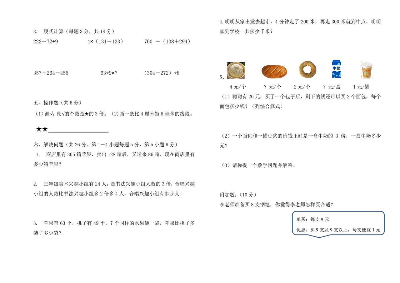 2025秋最新人教版数学三年级上册期中测试卷