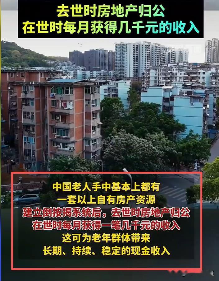 养老新风暴,黄奇帆提议,房产倒按揭 子女“继承权”悬了 黄奇帆最新提议,要搞“老年人房产倒按揭”。 这几个字一出来,我就知道,这要“炸”了。这哪是只给老人找钱,这简直是在动几亿中国家庭最敏感的那根神经——房产和继承! 这玩意儿是啥?我用大白话给你翻译: 老人把自己的房子押给机构(比如保险公司),人还能继续在里面住,但每个月能反过来从机构领一笔钱。说白了,就是用“死”的房子,换“活”的现金流。 等到老人百年之后,这套房子的处置权,就归那家机构了。 讲真的,我看到这就五味杂陈。 黄奇帆的出发点是好的。咱们“十五五”期间,马上就有3亿多老人了!这是什么概念? 现在多少老人,明明坐拥几百万的房产,每个月退休金就那么点,过得紧巴巴,生个病都怕拖累孩子。这个“倒按揭”,就是想把这笔巨大的存量房产“盘活”,让老人能靠自己,活得有尊严。 但这里面最刺心的矛盾来了: 儿女怎么办? 这房子要是“倒按揭”了,那儿女呢?几十年后,爹妈的房子没了,归金融机构了。这在“养儿防老、继承家产”的传统观念里,简直是天塌了! 这等于把“养老”和“继承”活生生撕开,摆在台面上让大家选。 当然,黄奇帆也说了,这得有配套。要立法,要监管。最近北京搞的那个“不动产信托登记”,还有广州黄埔那个千亿级的银发产业园,可能就是在给这事铺路。 我就想问一句:如果你是老人,你愿意拿这套房,换自己晚年的体面吗?如果你是儿女,你能接受父母的房子最后归“外人”吗? 住房反向抵押养老保险 房产倒按揭 住房