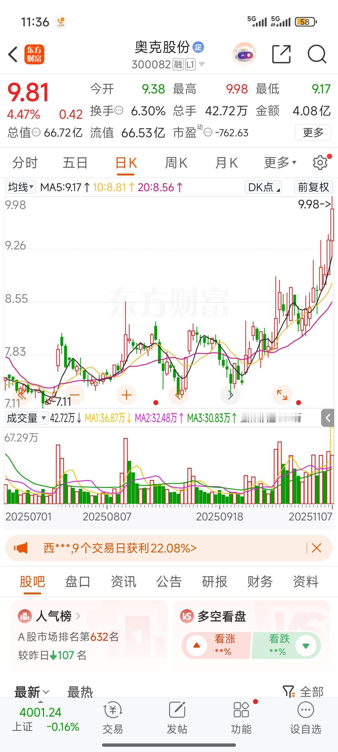 11月4号发出奥克股份是个好股之后,这两几天过来不负重望,一直缓慢逐步往上查,如果买入的话,应该是获利丰厚了。证明他确实是个好股。继续边走边看