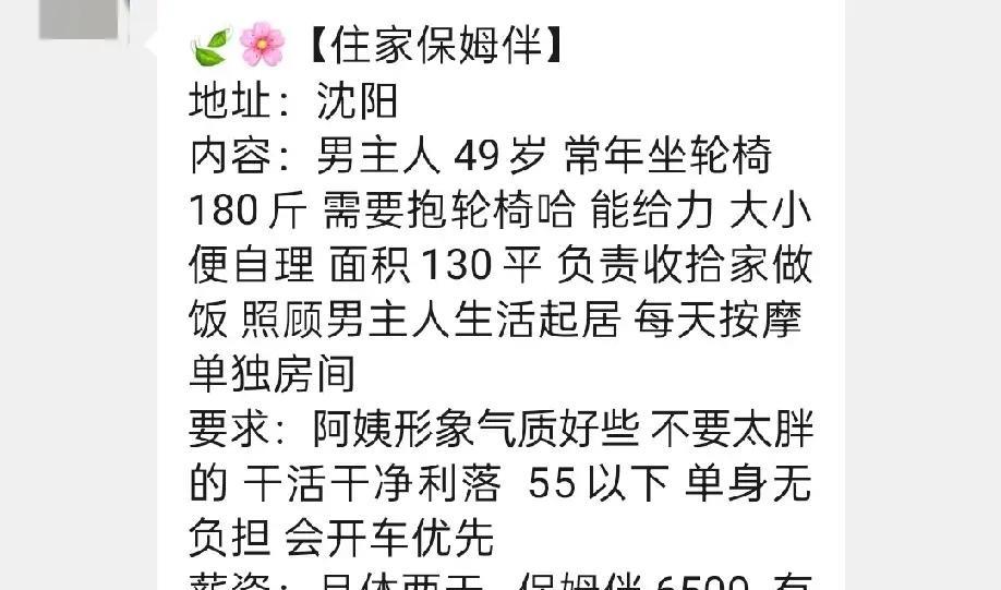 不懂就问,啥叫“住家保姆伴”? 住家保姆,明白。要求能举起来180斤,明白。要求形象气质好、不要太胖的、还得单身会开车,都能看明白。 但是,啥叫保姆伴?保姆还得加个伴,给6500能做到?