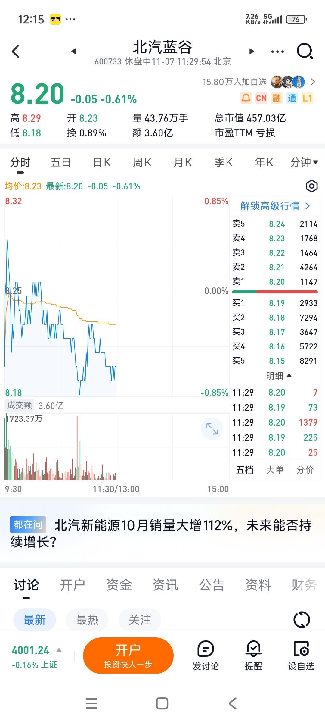 北汽蓝谷,8.20元挂单买入了20手,现在持仓210手,持仓成本7.9元...