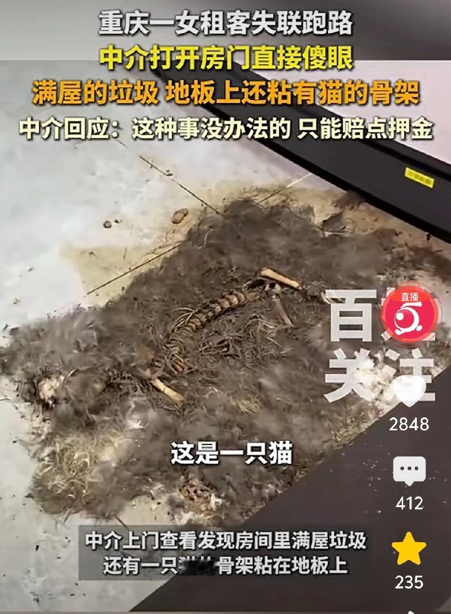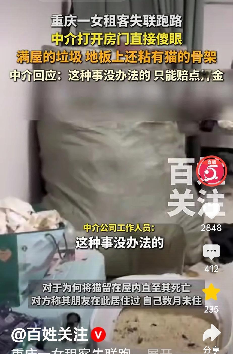这竟然是一位女孩子住的房间,看着就让人堵心。好好的房子糟蹋成啥样了! 最近,重庆一女租客失联数月,房东打开的房门的那一刻,被震撼到了! 只见遍地垃圾,不管是床上地下,还有卫生间里,到处都是垃圾,垃圾多的简直无处下脚。 这还不是最糟糕的,最离奇的是,地板上竟然有一具动物的尸骨,尸骨只剩下了一架骨头和毛,看起来像是猫,肉都腐了了。一个女人邋遢成这样,真是不可思议! 真是林子大了什么鸟儿都有!什么样的人,会这么不讲究自己生存的环境?哪怕深处垃圾堆,也不会主动清理一下。这样的人今后的人生肯定也处理不好。 养成这样的性格的人,估计,一个是自小生存的环境就脏乱差,见怪不怪了,所以自己也不懂的收拾。再一个就是懒,死懒不动颤,让他干点活跟要她命似的。以上这两种还算好的,无非就是自身的条件要求不高。 还有一种,那就是纯粹的坏,品质坏!故意给你搞得这么脏乱,恶心你,你拿我没办法。 这位租客无论是以上哪一种的行为,都是让人不能接受的。 希望有这种的行为的人,或者她本人看到了,一定要收敛一下,不然今后与人相处那会很难。 试想一下,谁愿意与这样的人相处一室? 图片来自网络,侵删致歉!