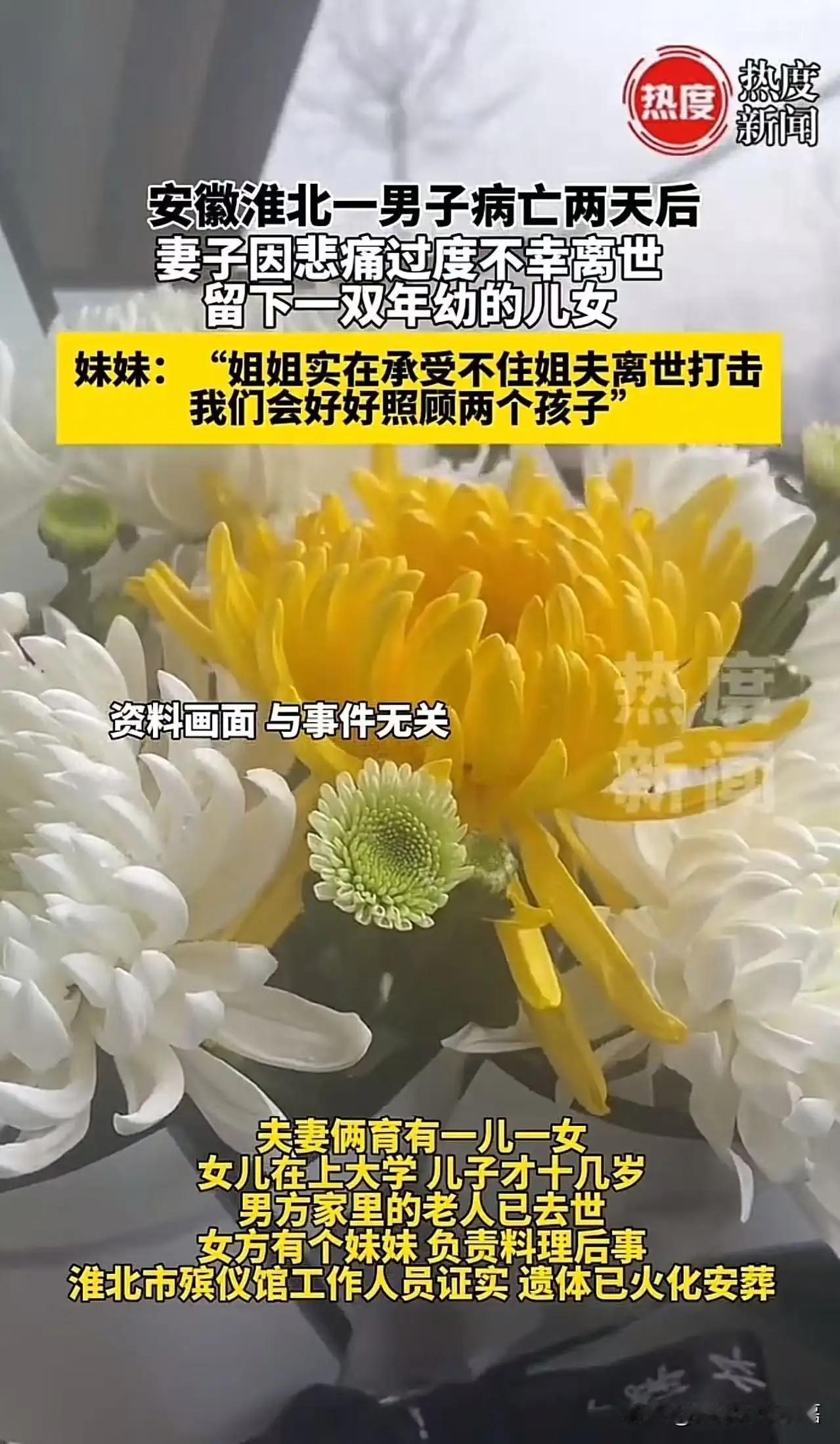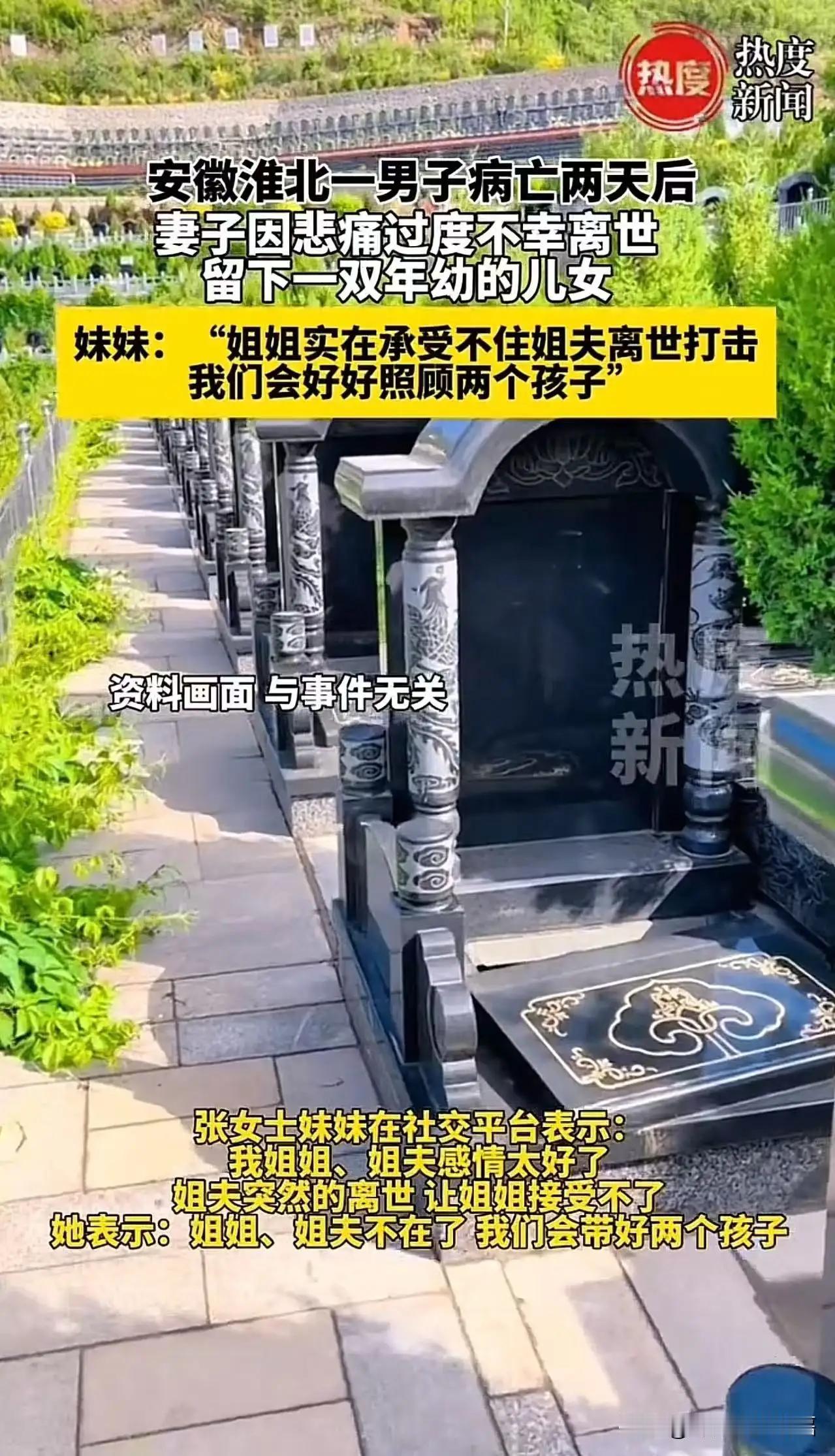 现代版梁山伯与祝英台!安徽淮北,一男子病亡两天后,妻子因悲痛过度不幸离世,留下一双年幼的儿女。网友:问世间情为何物,直教人生死相许! 张女士和丈夫育有一双儿女,女儿刚上大学;儿子也才十几岁。他们夫妻二人感情深厚,平日里相互扶持、相濡以沫,是邻里眼中令人羡慕的恩爱夫妻。 可是,命运却如此残酷无情。11月1日,丈夫毫无征兆地突发疾病,尽管家人心急如焚地送他去医院抢救,可最终还是无力回天,离开了人世。 这突如其来的噩耗如晴天霹雳,将这个原本幸福温馨的家庭瞬间撕裂成碎片。张女士的心仿佛被撕裂开来,难以承受的悲痛像潮水般涌来,将她淹没在无尽的绝望中。丈夫的离去,不仅带走了一个家庭的支柱,更像是撕裂了她生命中最坚实的那一部分。 两天后,悲痛还未散去,张女士的身体也开始扛不住这份沉重的打击。她那曾经充满笑容的脸庞,此刻只剩下一片空洞。家人拼尽全力安慰她,然而,心中的痛苦像一只看不见的巨手,紧紧攥住她的心脏。11月3日的那一刻,她终于倒在了悲伤的洪流中,再也无法醒来。 令人心碎的是,张女士的离去并没有结束这场悲剧。留给孩子们的,不仅仅是失去父母的痛,更是一份无法用言语表达的孤独。年幼的儿子还在懵懂中等待着父亲的归来,女儿刚刚步入大学的门槛,却不得不面对这个突如其来的家庭变故。 网友们纷纷感慨:爱情和亲情,原来如此脆弱,却又如此伟大。有人说,这是现代版的“梁山伯与祝英台”,是天意的捉弄,还是人性的悲哀?但更多的人开始反思:在这个快节奏、压力山大的社会中,我们是否真正懂得珍惜身边的人?是否用心去感受每一次相聚的温暖? 这场悲剧折射出的是人性最深层的脆弱与坚韧。爱,是生命中最动人的力量,也是最易碎的宝藏。有人说,爱让人勇敢,也让人心碎,但无论如何,爱都值得我们用一生去守护。因为,正是那些在平凡中相守的瞬间,才让生命变得如此珍贵。 或许,我们都应该从这场悲剧中汲取一些力量。学会在繁忙的生活中放慢脚步,学会用心去感受那些微小的幸福。不要等到失去时,才懂得珍惜。愿每一个家庭都能在爱中成长,在悲欢离合中变得更加坚韧。 最后,希望这个家庭的故事能唤起更多人的共鸣:爱,是人生中最美的礼物,也是我们最应该用心呵护的珍宝。在这个充满变数的世界里,让我们用爱点亮生命的每一个角落,让悲剧不再重演,让爱永远长存。头号周刊 安徽婚姻悲剧