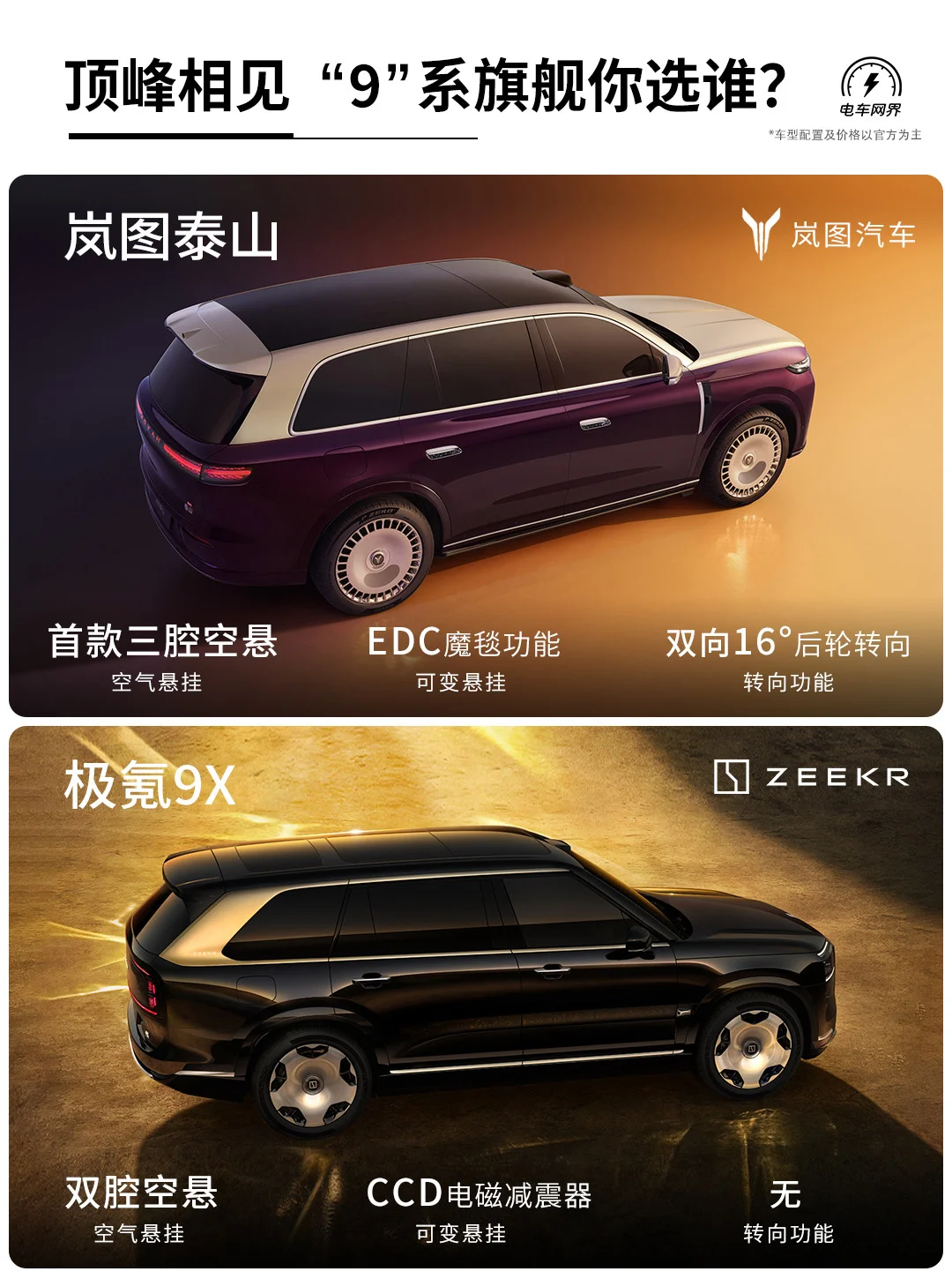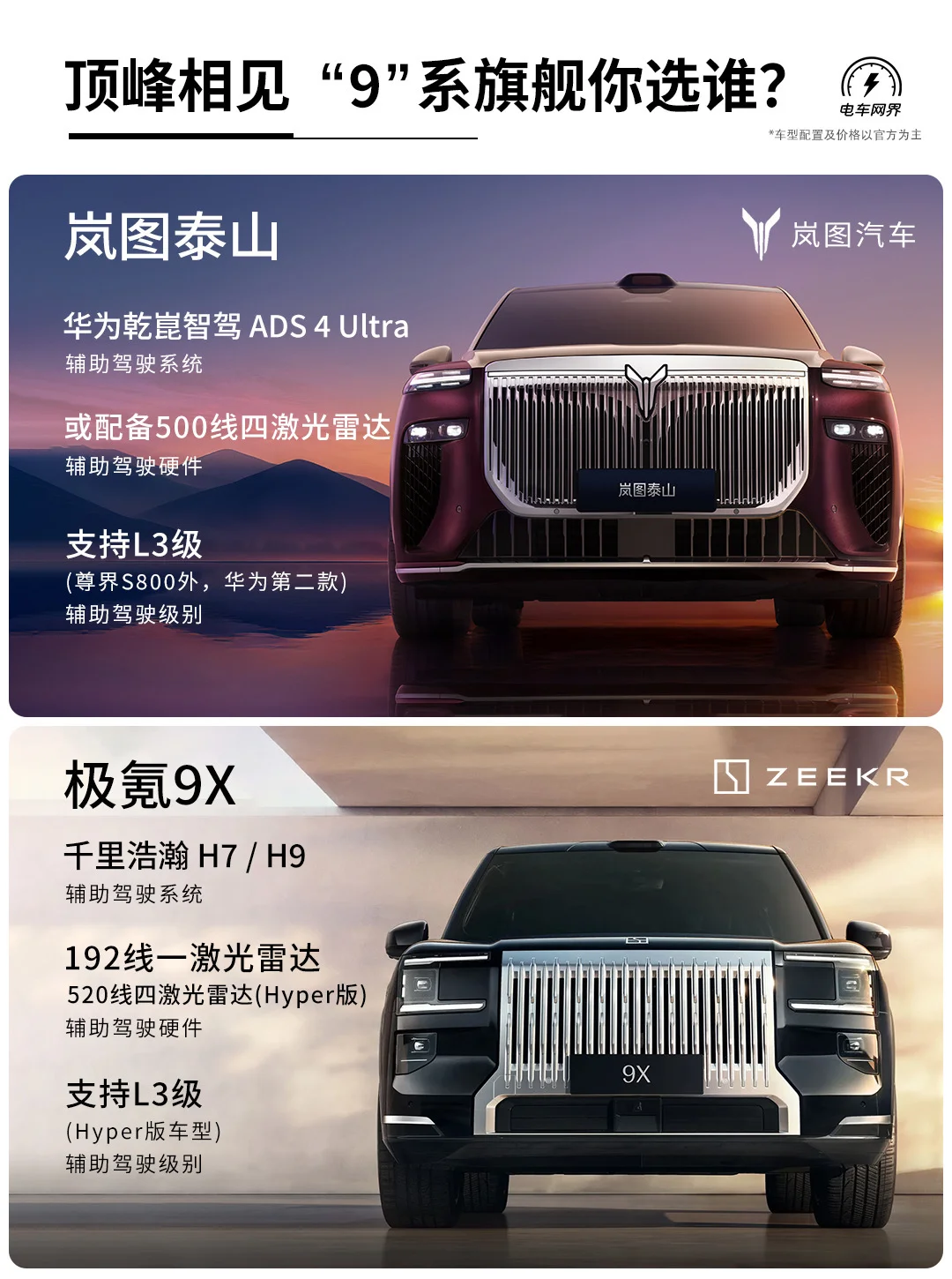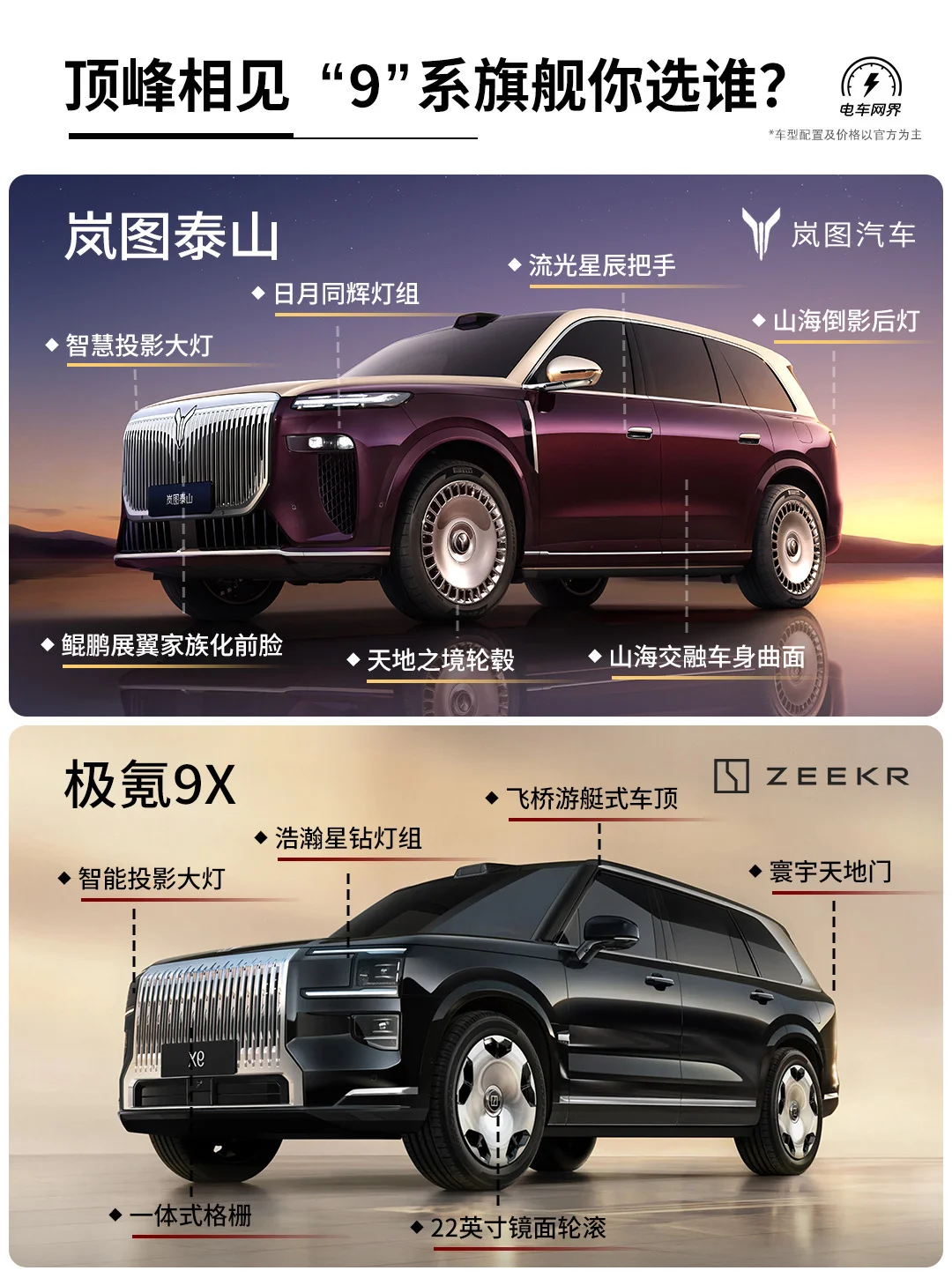 今年“9系”大六座SUV市场格外精彩,要说最让我关注的两款车,当属极氪9X和即将上市的岚图泰山。它们都自带强大气场,而泰山作为华系旗舰新作,有不少亮点值得聊聊。今天就以极氪9X为参照,看看泰山的实力如何。 [一R]外观设计 ⭕ 我个人觉得“泰山”这名字特别贴切,整车给人一种沉稳而磅礴的直观感受,耐看又显气场。加上智慧投影大灯、迎宾光毯和流光把手这些非常有调性的配置,整车的仪式感肯定给你拉满。 ⭕ 极氪9X不愧被称为“杭州湾库里南”,气质这块拿捏得相当不错,悬浮车顶和大饼轮毂的组合气场很强,前后灯组的辨识度也非常高。 [二R]辅助驾驶 ⭕ 泰山搭载了华为乾崑智驾ADS 4 Ultra,据说或许会配备500线四激光雷达,这让我对它的辅助驾驶水准和未来可以升级L3级的潜力都相当有信心。 ⭕ 极氪9x提供了千里浩瀚H7和H9两套辅助驾驶系统选择,其中Hyper版本的1+4激光雷达方案也是非常有看点的。 [三R]底盘操控 ⭕ 泰山作为首搭三腔空悬和EDC魔毯功能的车型,让我对它的舒适与稳定抱有很高期待,还有后轮转向的加入,应该能让它在城里开起来灵活不少。 ⭕ 极氪9x用的双腔空悬和电磁减振组合,配合主动稳定杆,在过弯和激烈驾驶时能提供不错的操控质感。 [星R]总的来说,这两款旗舰展现了不同的顶尖路线:泰山更注重智能科技与“中式豪华”的融合,适合追求豪华体验、前沿智驾与文化自信的当代菁英;极氪9X则更侧重于运动驾控,适合追求个性表达与纯粹驾驶乐趣的驾驭爱好者。如果是您,会更倾向于哪一种风格呢?