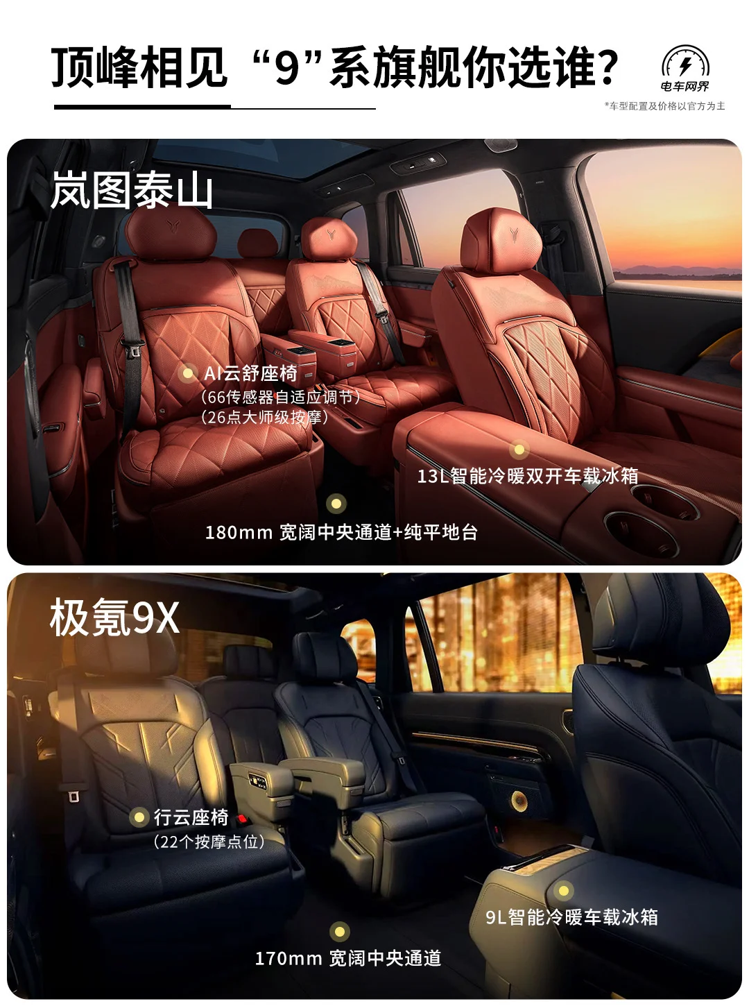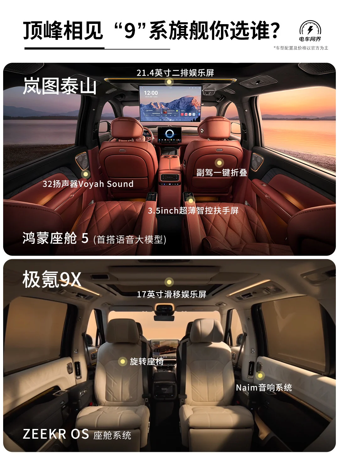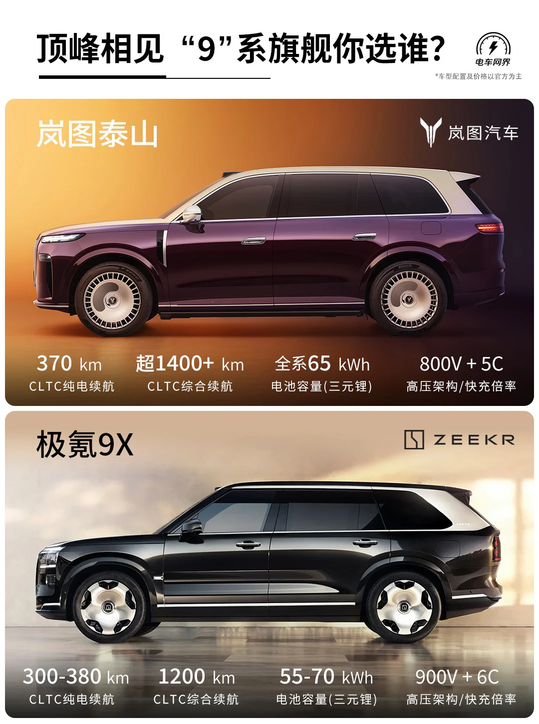 今年“9系”大六座SUV市场格外精彩,要说最让我关注的两款车,当属极氪9X和即将上市的岚图泰山。它们都自带强大气场,而泰山作为华系旗舰新作,有不少亮点值得聊聊。今天就以极氪9X为参照,看看泰山的实力如何。 [一R]外观设计 ⭕ 我个人觉得“泰山”这名字特别贴切,整车给人一种沉稳而磅礴的直观感受,耐看又显气场。加上智慧投影大灯、迎宾光毯和流光把手这些非常有调性的配置,整车的仪式感肯定给你拉满。 ⭕ 极氪9X不愧被称为“杭州湾库里南”,气质这块拿捏得相当不错,悬浮车顶和大饼轮毂的组合气场很强,前后灯组的辨识度也非常高。 [二R]辅助驾驶 ⭕ 泰山搭载了华为乾崑智驾ADS 4 Ultra,据说或许会配备500线四激光雷达,这让我对它的辅助驾驶水准和未来可以升级L3级的潜力都相当有信心。 ⭕ 极氪9x提供了千里浩瀚H7和H9两套辅助驾驶系统选择,其中Hyper版本的1+4激光雷达方案也是非常有看点的。 [三R]底盘操控 ⭕ 泰山作为首搭三腔空悬和EDC魔毯功能的车型,让我对它的舒适与稳定抱有很高期待,还有后轮转向的加入,应该能让它在城里开起来灵活不少。 ⭕ 极氪9x用的双腔空悬和电磁减振组合,配合主动稳定杆,在过弯和激烈驾驶时能提供不错的操控质感。 [星R]总的来说,这两款旗舰展现了不同的顶尖路线:泰山更注重智能科技与“中式豪华”的融合,适合追求豪华体验、前沿智驾与文化自信的当代菁英;极氪9X则更侧重于运动驾控,适合追求个性表达与纯粹驾驶乐趣的驾驭爱好者。如果是您,会更倾向于哪一种风格呢?