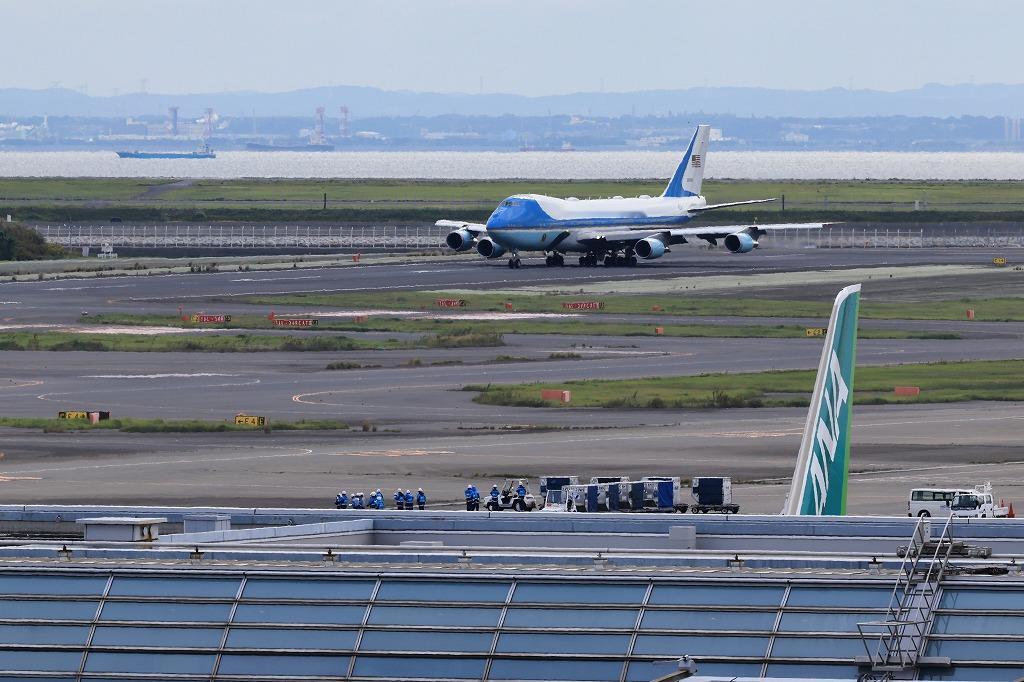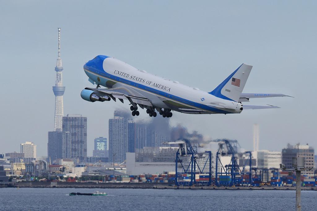 早先时间,VC-25A空军一号从羽田机场起飞前往釜山金海国际机场参加APEC峰会