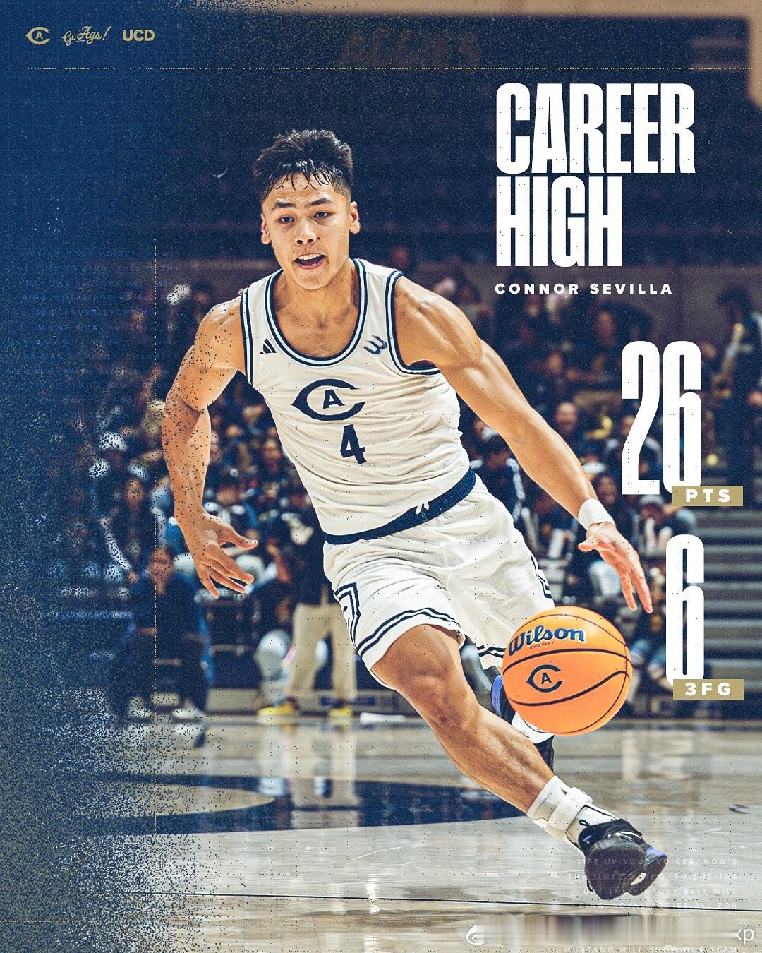 UC Davis大三菲律宾裔小后卫Connor Sevilla新赛季首秀砍下NCAA个人生涯得分新高26分2板1助,三分球7中6亚洲篮球