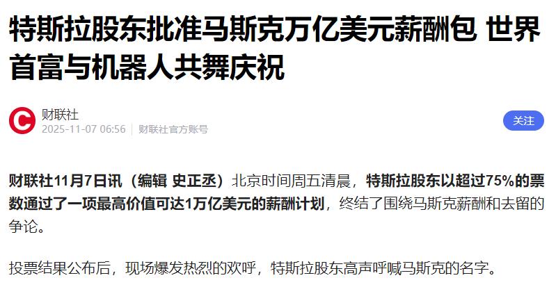 马斯克1万亿美元薪水获得董事会批准,分10年以股份支付。   11月7日,特斯拉股东以超过75%的票数通过这份万亿美元薪酬计划时,看似是给马斯克的顶级奖励,实则抛出了一份绑死十年的天价对赌协议。   马斯克要想拿这笔钱,得先把特斯拉从当前1.5万亿美元左右的市值硬生生拽到8.5万亿美元,还得靠无人驾驶出租车和人形机器人这俩没真正跑通的业务撑起来,这难度简直堪比登天。   这份计划里的目标拆开来更离谱,市值要分12个阶段解锁,从2万亿美元开始层层加码,最后两步直接each跳涨1万亿美元,同时还得搞定四大运营里程碑:累计交付2000万辆汽车倒还好说,但100万辆Robotaxi投入商业化运营、100万台人形机器人交付、1000万FSD活跃订阅用户,每一个都透着不切实际。   更别提财务目标,调整后EBITDA要从2024年的166亿美元冲到4000亿美元,足足23倍的增幅,光靠卖车根本不可能实现。   马斯克上回2018年的薪酬计划已经够激进,要从600亿美元市值做到6500亿,最后靠电动车风口勉强达成,可这次的目标是上次的十多倍,且依赖的是完全没验证过的新赛道。   就说无人驾驶,Waymo都已经在凤凰城、旧金山运营多年,刚新增底特律、拉斯维加斯三城,周订单早突破25万单,还喊出2026年百万单的目标。   而特斯拉的无人驾驶出租车,至今只在奥斯汀小范围搞有人值守测试,连公开运营的影子都没见着,要追上对手还得搞定法规、安全等一堆麻烦事,100万辆的目标有点困难。   人形机器人商业化的进度更让人着急,马斯克年初喊着2025年生产5000台,结果到7月产量才数百台,连计划的零头都没到,核心的手部制造还卡着瓶颈。   要累计交付100万台,马斯克就算从2026年开始销售,每年也得卖10万台以上,可现在连工厂试运营都刚启动,更别说解决作业数据缺失、成本控制这些行业通病。   更讽刺的是,这计划还得靠马斯克全身心投入,可他还管着SpaceX、X平台等一堆公司,能不能把精力放特斯拉都是个问题。   挪威主权基金这些大股东早跳出来反对,可架不住小股东们怕马斯克跑路,毕竟他之前暗示过不通过就考虑离职,而摩根士丹利说了,他走了股价可能立马就跌超10%,这简直是逼着股东投赞成票。   现在就算股东认了,市场也未必买账,特斯拉现在市值波动极大,前几天还一夜蒸发802亿美元,要保持每年近20%的复合增长率,得让新业务立刻爆发出盈利能力。   可放眼整个行业,没有哪家公司能靠无人驾驶或人形机器人赚大钱,这场赌局,恐怕真要变成一场耗时十年的空想。