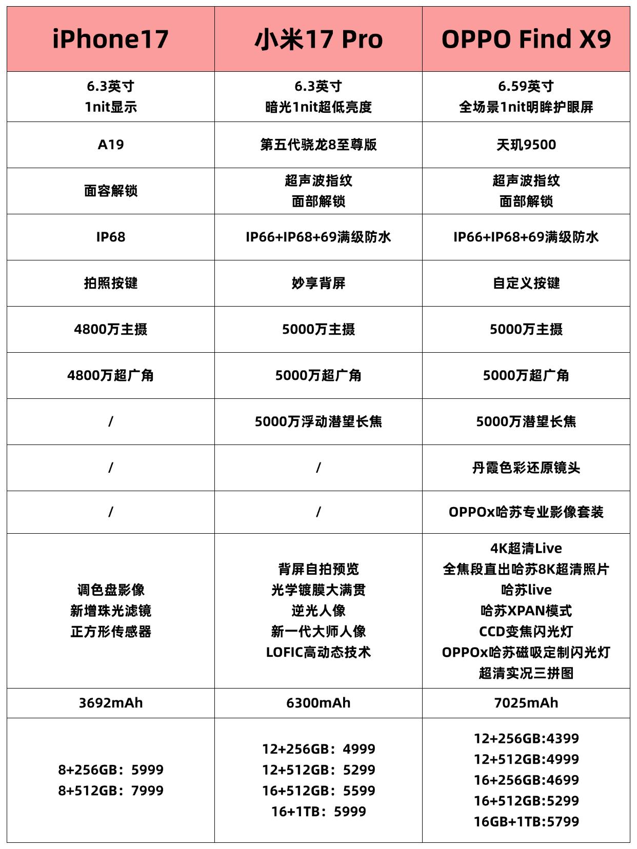 zui火的旗舰就这3台了吧?帮我看还漏了啥 年底了打算换手机,打算用个三年以上的,所以挑了好久,现在网上zui火的就这3台了吧?iPhone 17、小米17 Pro和OPPO Find X9,专门整理了这几款都配置,大家看看还有漏了什么? 苹果的话是说今年有高刷屏,所以很值得入。小米是看着背屏挺有意思的,配置性能也都不错。OPPO感觉会全面一点,哈苏四摄拍照也更强,电池还更大,有7000+👁 现在是纠结要选哪款好,大家觉得还有啥要注意的?🤔