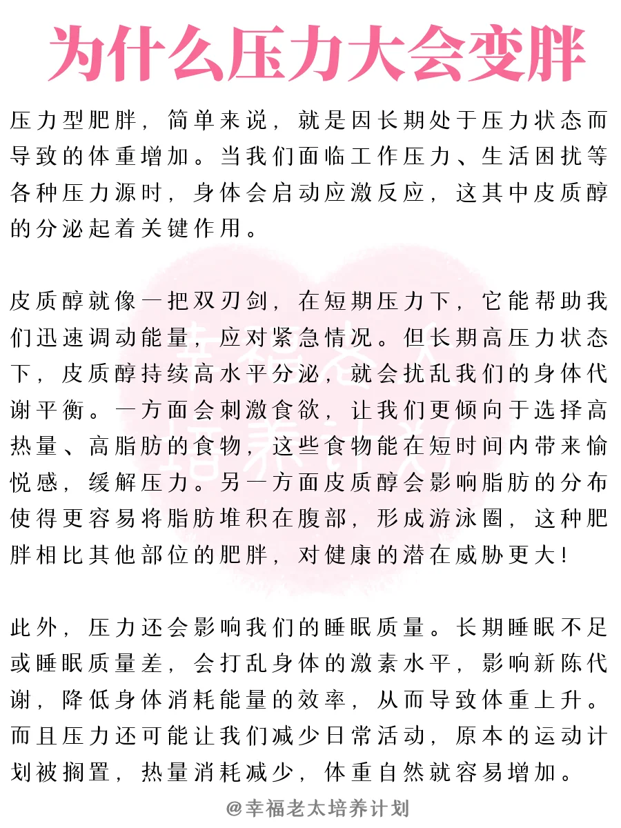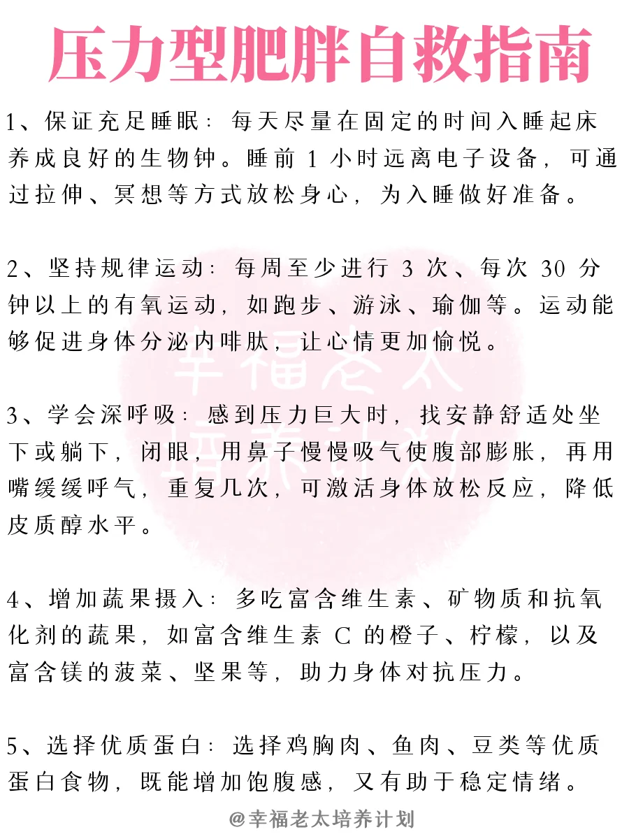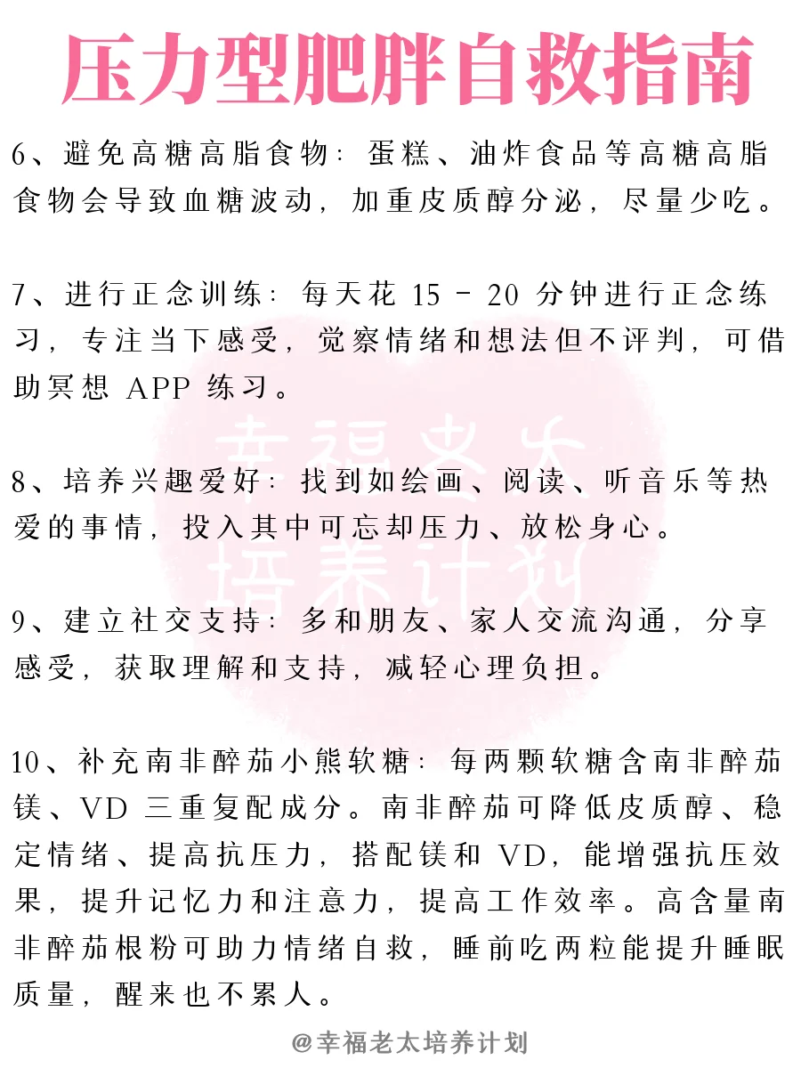 工作压力大,情绪像坐过山车,还总是忍不住暴饮暴食,体重也跟着一路飙升?这其实都是压力在作祟,尤其是 “压力激素” 皮质醇在捣乱。长期高压力状态下,皮质醇持续大量分泌,不仅影响情绪,还会刺激食欲,导致脂肪在腹部堆积,形成压力型肥胖,甚至严重影响睡眠质量。别慌,下面这些超有效的自救方法,能帮你降低皮质醇,稳定情绪,提高抗压能力,改善睡眠: 1、保证充足睡眠:每天尽量在固定的时间入睡起床养成良好的生物钟。睡前 1 小时远离电子设备,可通过拉伸、冥想等方式放松身心,为入睡做好准备。 2、坚持规律运动:每周至少进行 3 次、每次 30 分钟以上的有氧运动,如跑步、游泳、瑜伽等。运动能够促进身体分泌内啡肽,让心情更加愉悦。 3、学会深呼吸:感到压力巨大时,找安静舒适处坐下或躺下,闭眼,用鼻子慢慢吸气使腹部膨胀,再用嘴缓缓呼气,重复几次,可激活身体放松反应,降低皮质醇水平。 4、增加蔬果摄入:多吃富含维生素、矿物质和抗氧化剂的蔬果,如富含维生素 C 的橙子、柠檬,以及富含镁的菠菜、坚果等,助力身体对抗压力。 5、选择优质蛋白:选择鸡胸肉、鱼肉、豆类等优质蛋白食物,既能增加饱腹感,又有助于稳定情绪。 6、避免高糖高脂食物:蛋糕、油炸食品等高糖高脂食物会导致血糖波动,加重皮质醇分泌,尽量少吃。 7、进行正念训练:每天花 15 - 20 分钟进行正念练习,专注当下感受,觉察情绪和想法但不评判,可借助冥想 APP 练习。 8、培养兴趣爱好:找到如绘画、阅读、听音乐等热爱的事情,投入其中可忘却压力、放松身心。 9、建立社交支持:多和朋友、家人交流沟通,分享感受,获取理解和支持,减轻心理负担。 10、补充南非醉茄小熊软糖:每两颗软糖含3600mg南非醉茄根粉、镁、VD 三重复配成分。可降低皮质醇浓度、调节情绪及心态、提高对压力的抵抗力,提升记忆力和注意力。高含量南非醉茄根粉可助力情绪自救,心态好了之后就不会再产生对高热量食物的强烈欲望,对“游泳圈”的改善很有效。