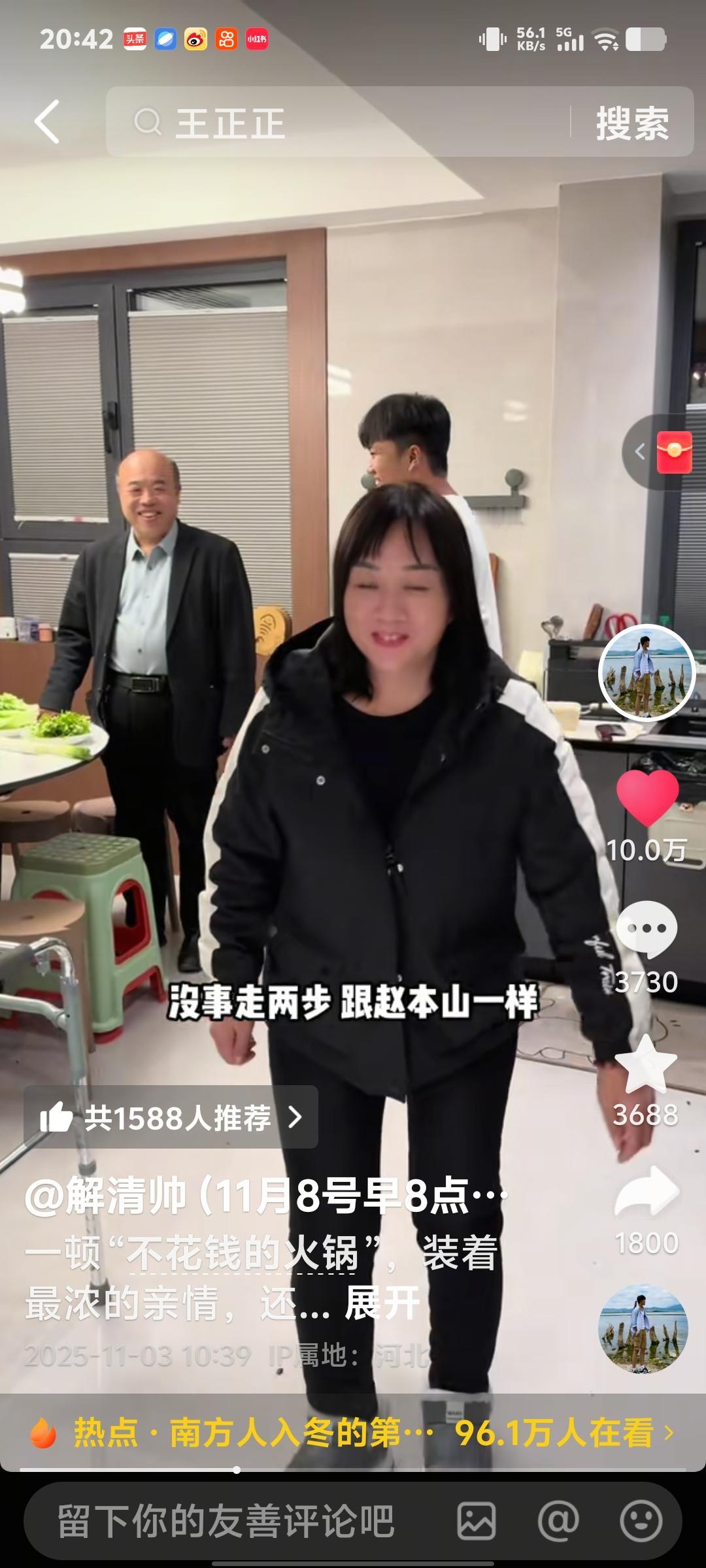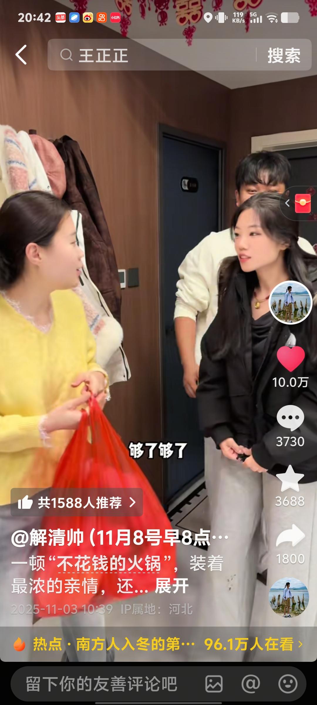 破防!解青帅新婚家摆火锅宴,全家分工投喂小两口,冯晓云康复亮相,直播带货满是幸福~ 解青帅和家人集合,要直播卖货了。正正大嫂和良静。三大美女出镜,帅帅大哥和表弟。站在身后。 昨晚帅帅和正正在新婚的家里请全家人吃火锅,帅帅。站在那儿打电话。 让大哥带酒,老爹带菜。弟弟带调料。小两口啥也不用干。也不用花1分钱。就能吃到火锅了,真是太聪明了。 离妈妈家里近,真好。老爸端着菜。冯晓云拄着拐杖。马上就来到家里。 冯晓云一瘸一拐的走了几步,向大家展示,脚已经好的差不多了,接着梁静也带了一大兜菜过来。 帅帅和老爸又到小菜园里拔了一些生菜。大哥一家四口也来了。满满和小橙子特别开心。 火锅冒起蒸腾的热气。全家人围在一起。整个房间里洒满欢声笑语。这就是对幸福的最好诠释。 帅帅举杯感谢父母。感谢哥哥,嫂子,弟弟,妹妹一直以来对他们的帮助和支持, 冯晓云和解克峰叮嘱儿女们注意身体。无论有多难的事儿,全家拧成一股绳,互相支撑。 老人的说法是对的。解青帅前两个月也遭遇了人生的低谷。遇到了很多的网络黑粉。因为有全家人的支持,他们坚持过来了。 所以希望把孩子找回家的家庭能够团结一致。给孩子最大的支持。也希望孩子能够真心回归。