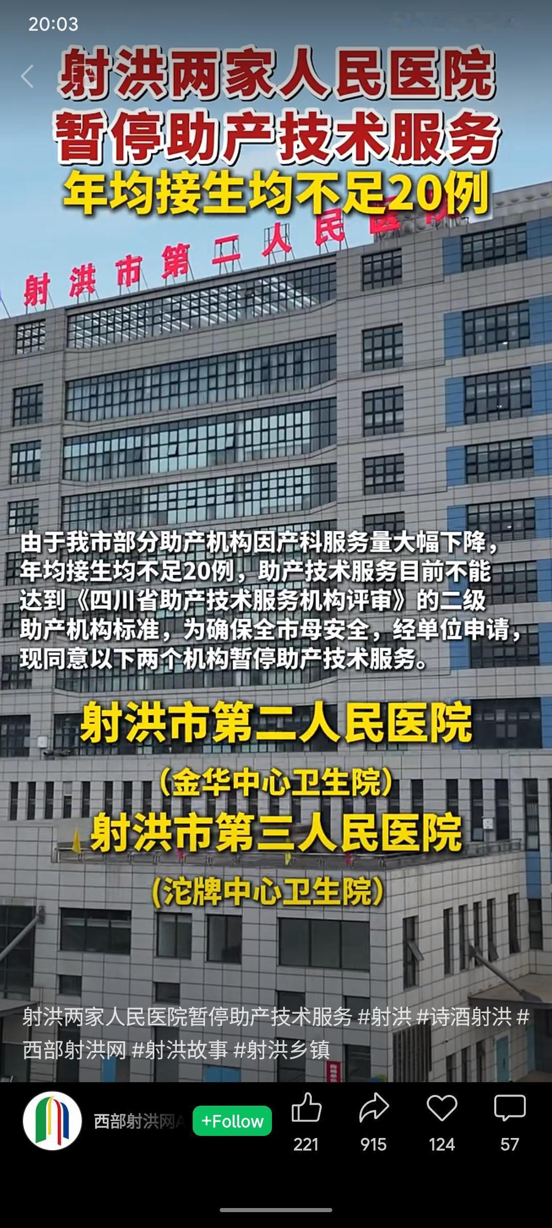 因年均接生量不足20例,射洪市第二人民医院和第三人民医院的助产服务无法达到四川省二级助产机构标准。为确保母婴安全,经医院申请,射洪市卫生健康局已同意这两家机构暂停助产技术服务。